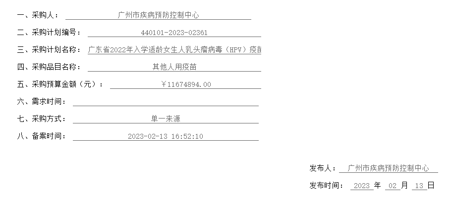 【广州市疾病预防控制中心】广东省2022年入学适龄女生人乳头瘤病毒(HPV)疫苗第二针采购项目(广州疾控中心)