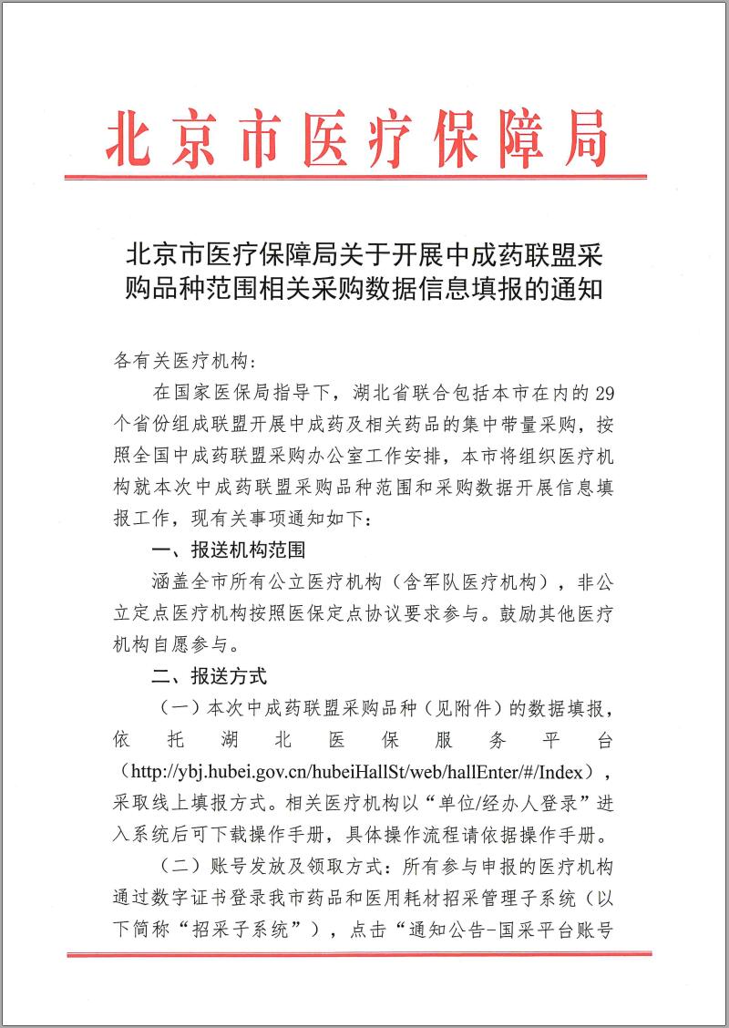 【北京】北京市医疗保障局关于开展中成药联盟采购品种范围相关采购数据信息填报的通知