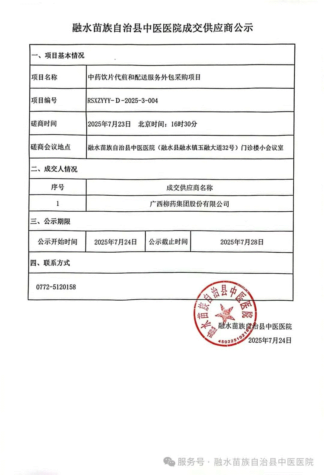 【柳州市融水苗族自治县中医医院】广西壮族自治区柳州市融水苗族自治县中医医院中药饮片代煎和配送服务外包采购项目成交供应商公示