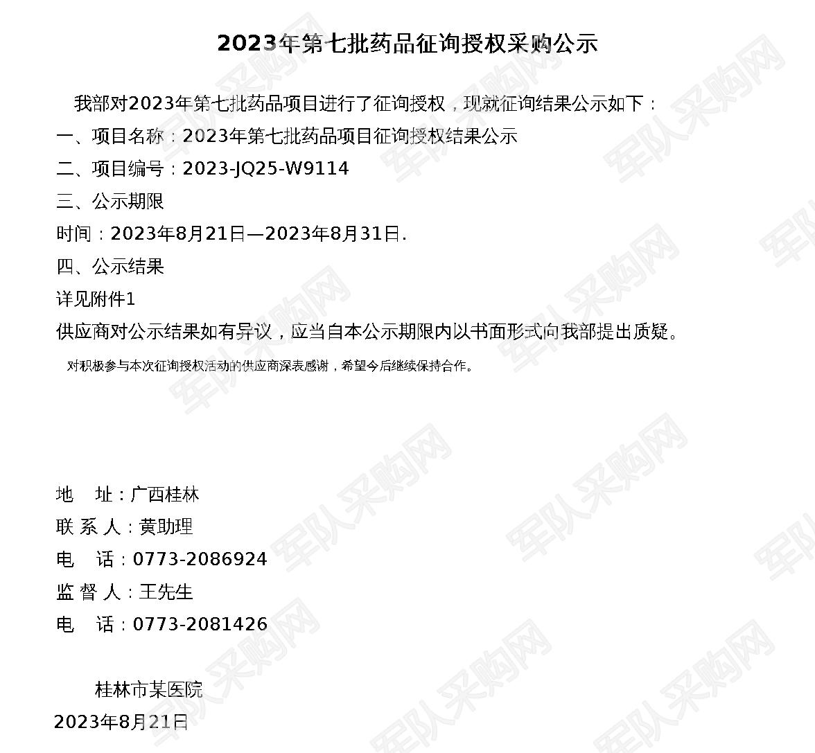 【军队采购】军队采购网2023年第七批药品征询授权采购公示(2023-JQ25-W9114)