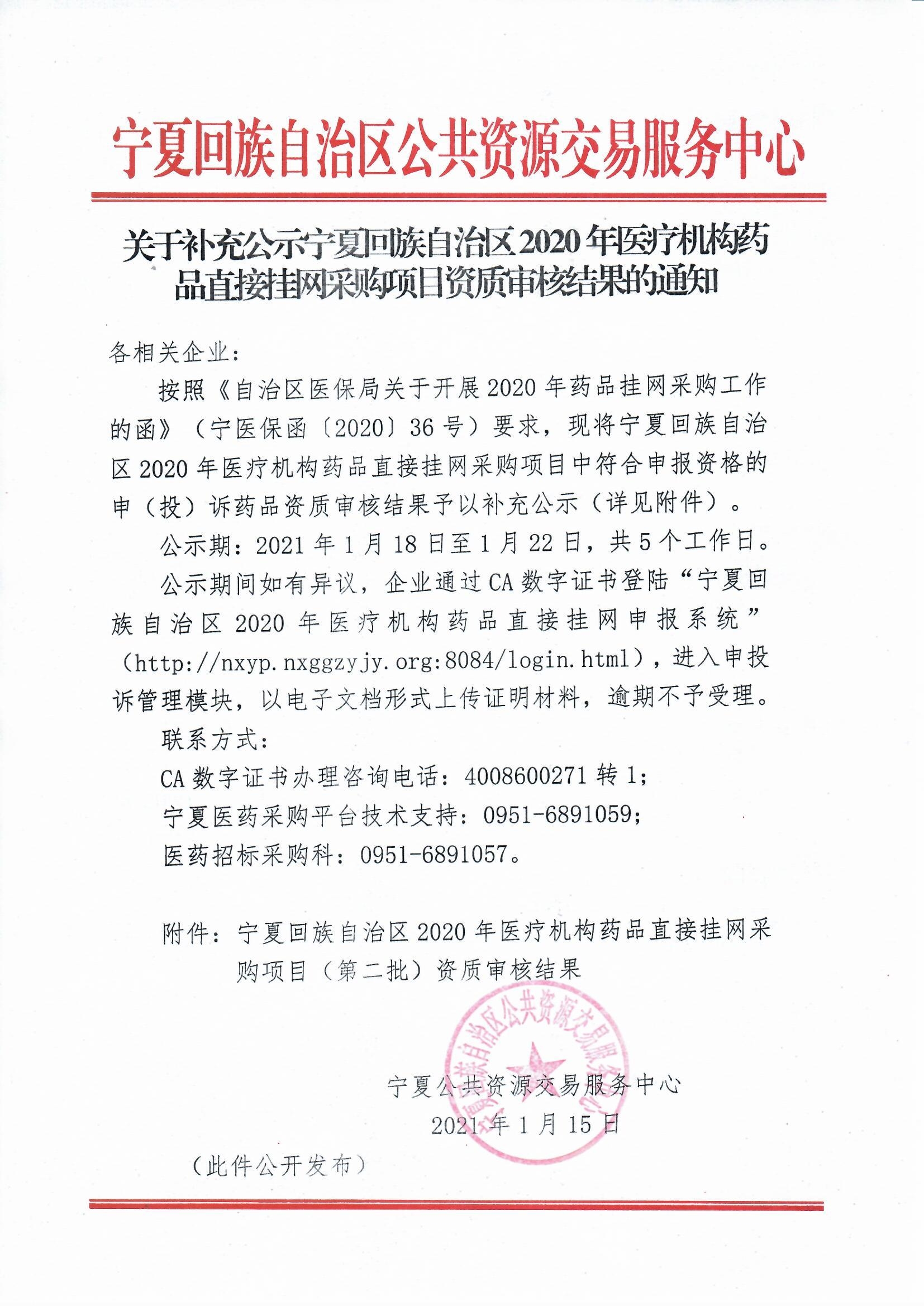 【宁夏】2021年宁夏自治区关于补充公示宁夏回族自治区2020年医疗机构药品直接挂网采购项目资质审核结果的通知