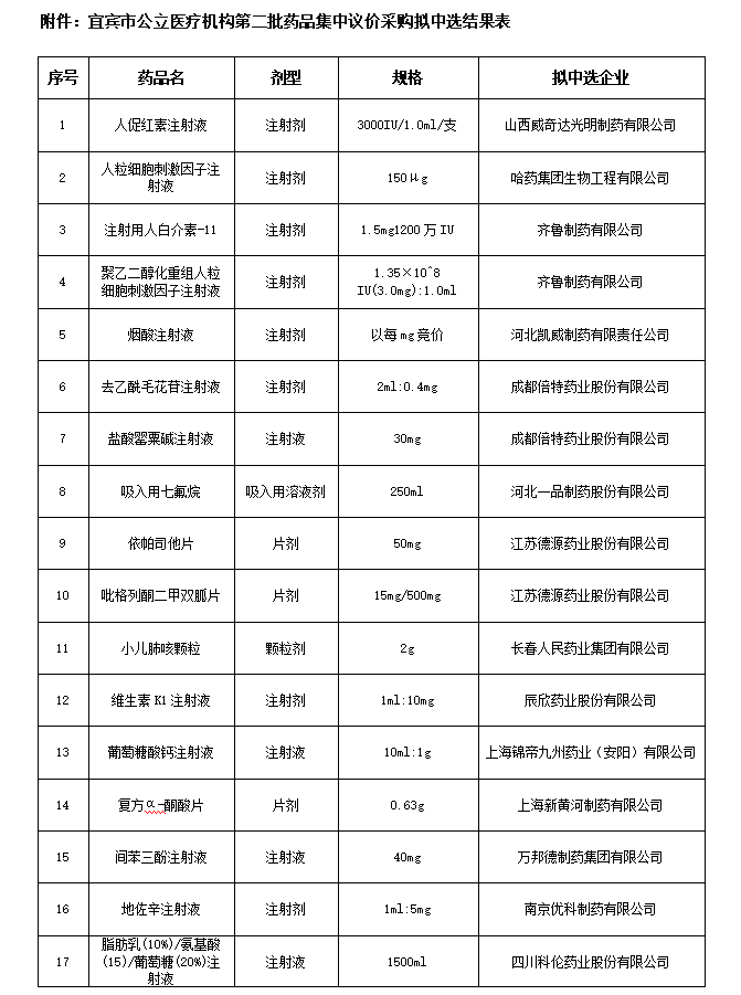 附件:宜宾市公立医疗机构第二批药品集中议价采购拟中选结果表