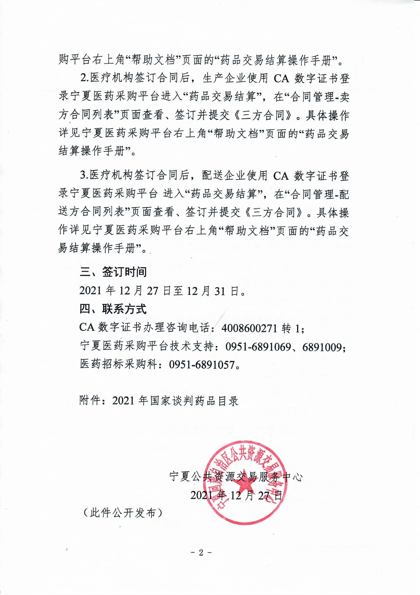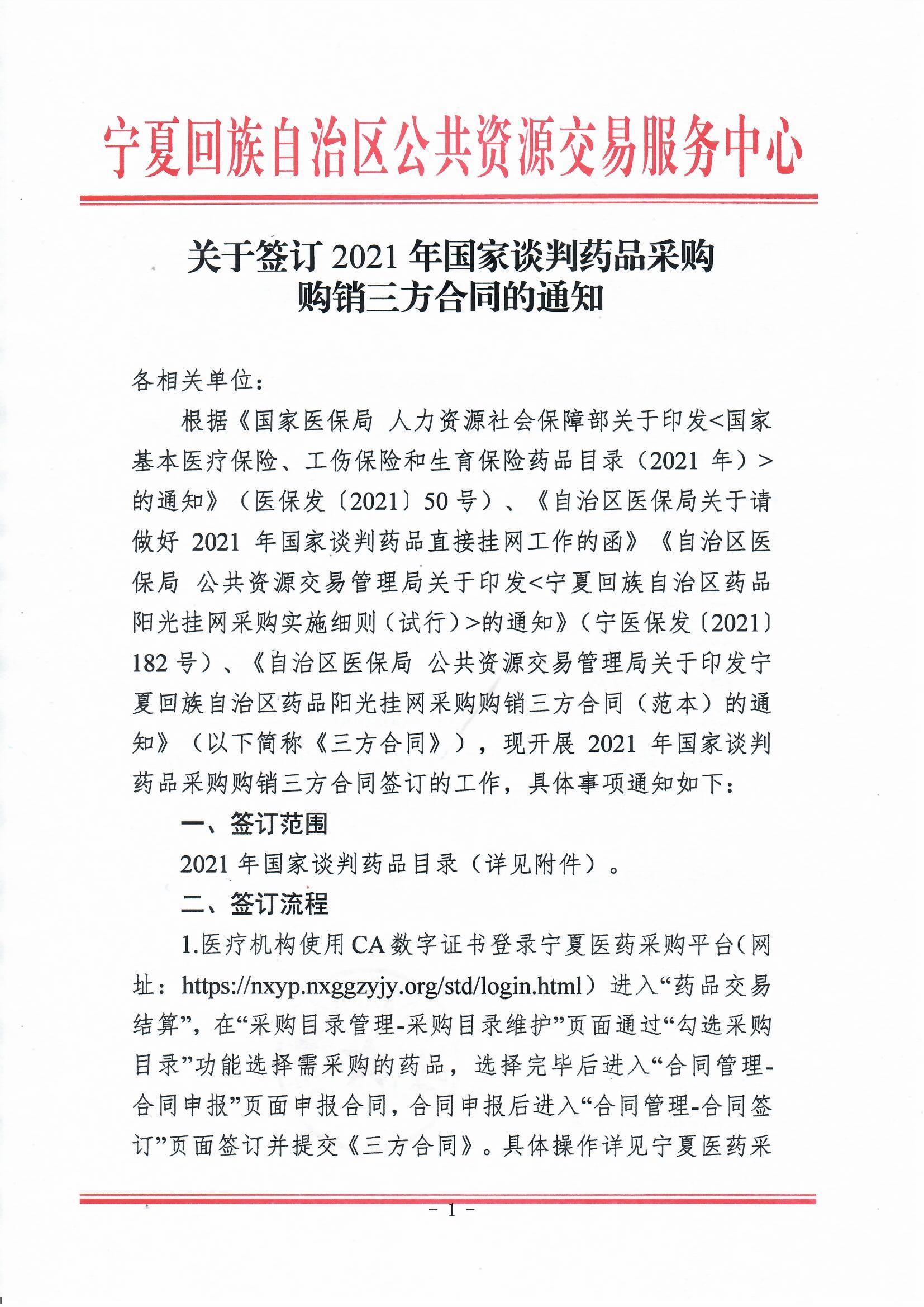 【宁夏】宁夏回族自治区关于签订2021年国家谈判药品采购购销三方合同的通知