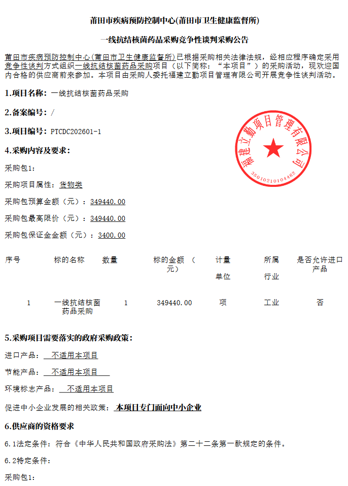 【莆田市疾病预防控制中心】福建省莆田市疾病预防控制中心(莆田市卫生健康监督所)一线抗结核菌药品采购竞争性谈判采购公告