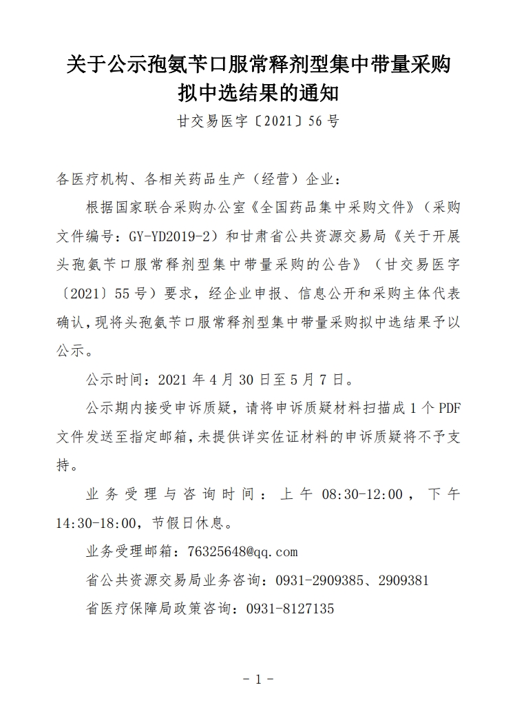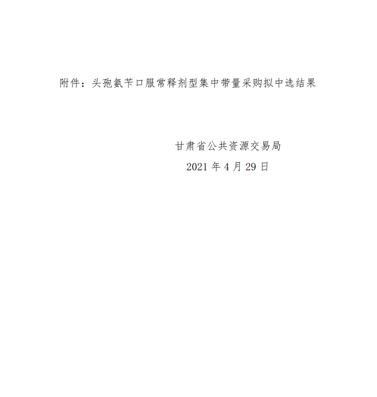 【甘肃】2021年甘肃省关于公示孢氨苄口服常释剂型集中带量采购拟中选结果的通知 甘交易医字〔2021〕56号