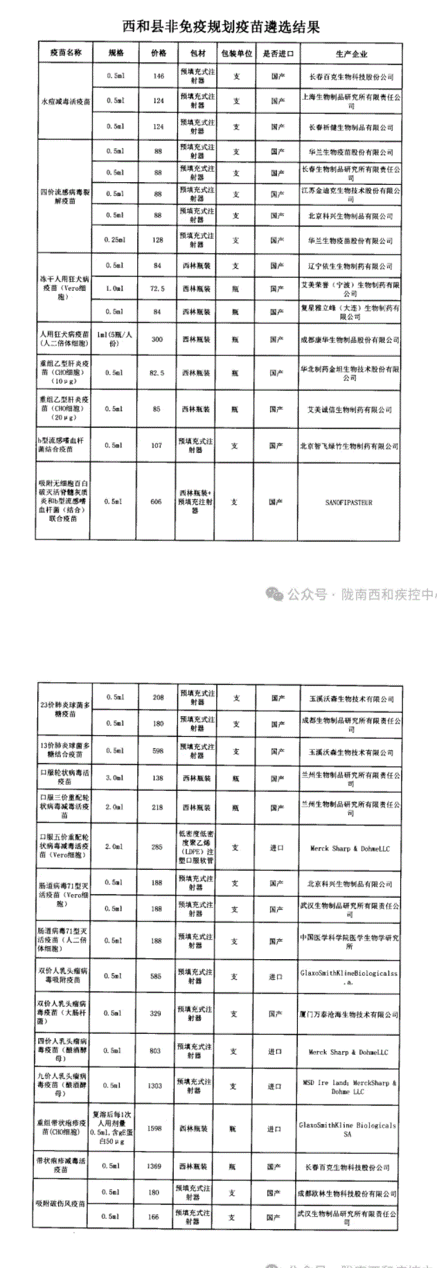 【陇南】西和县2025年度非免疫规划疫苗遴选结果公示