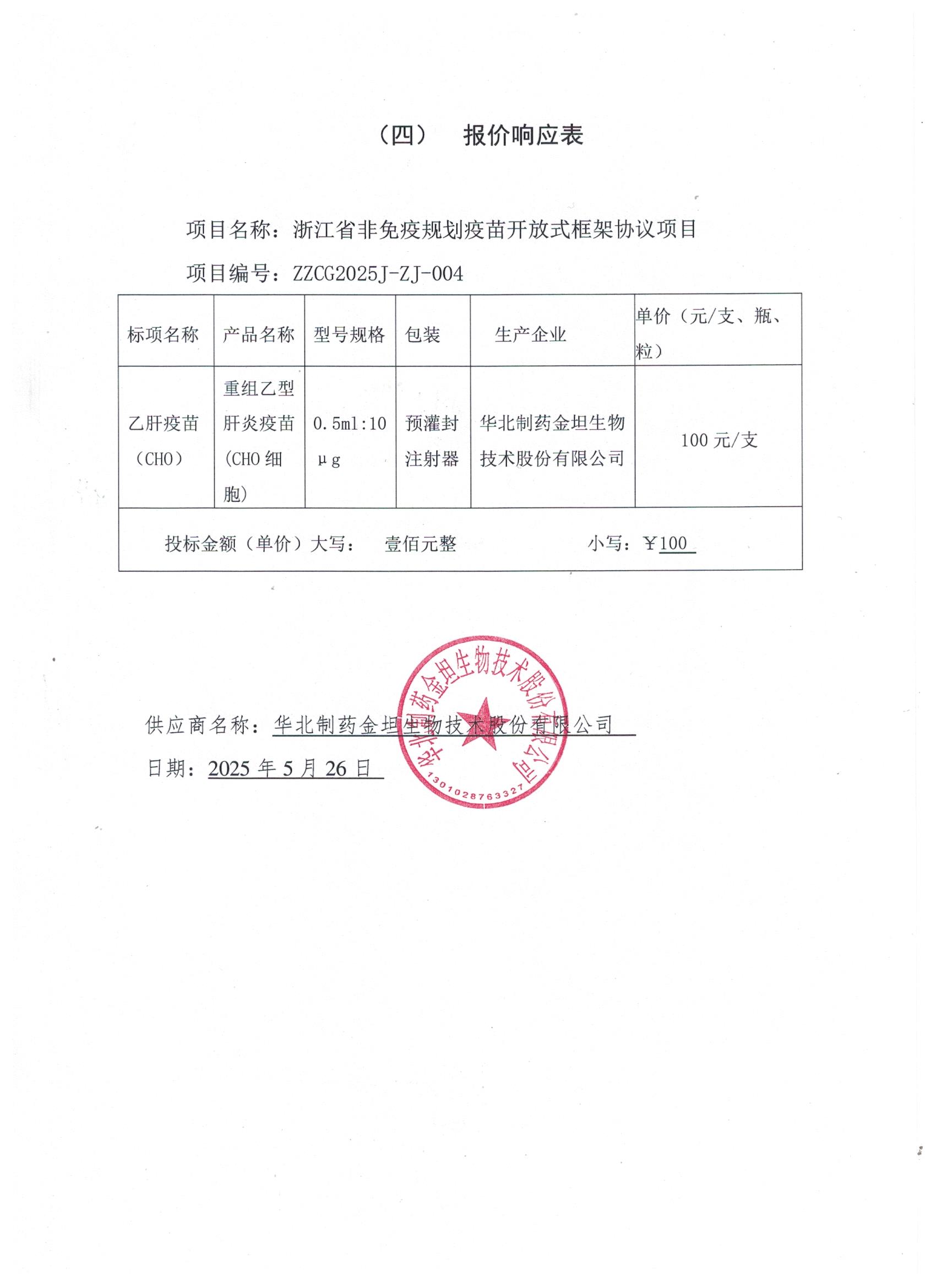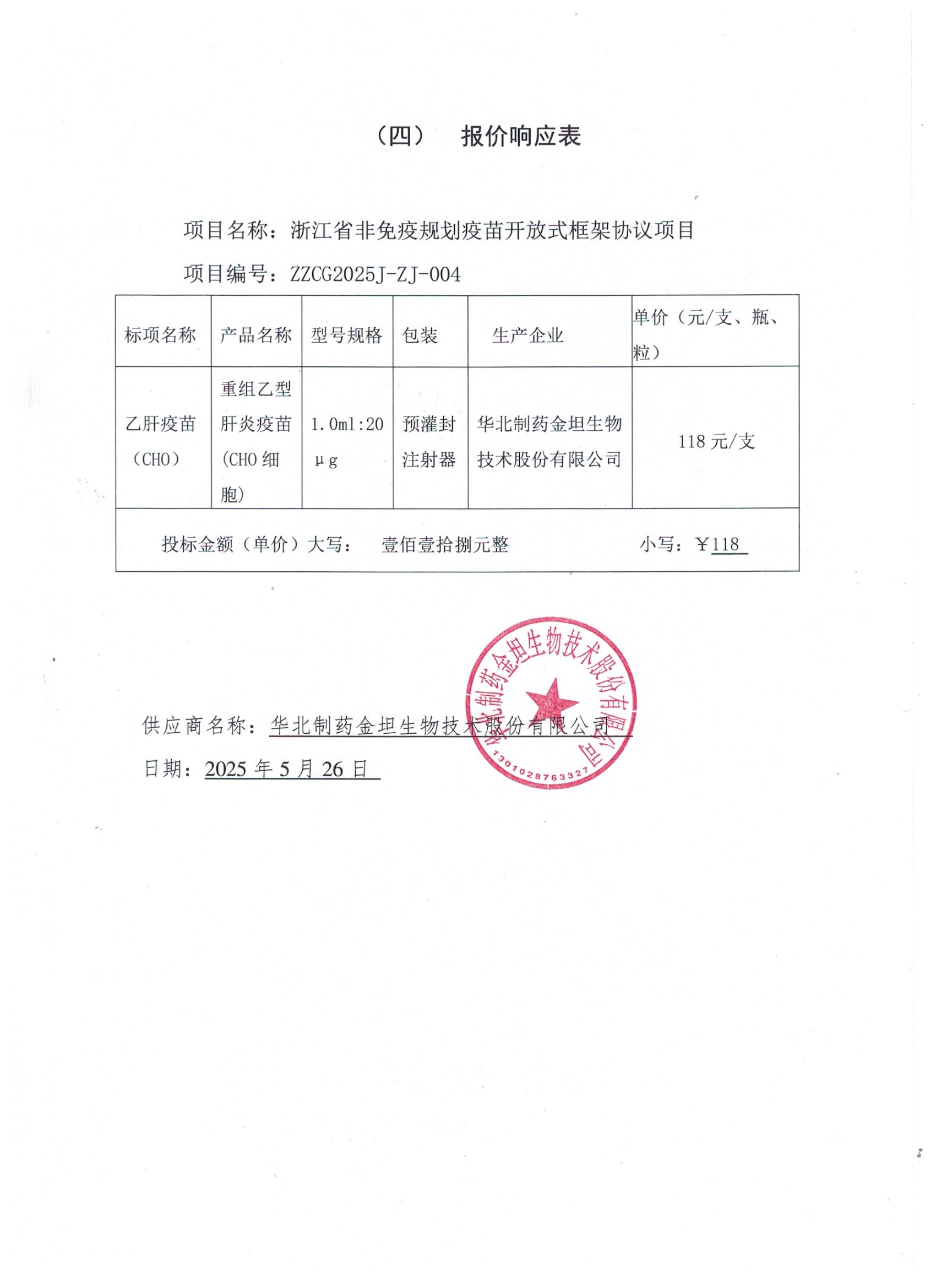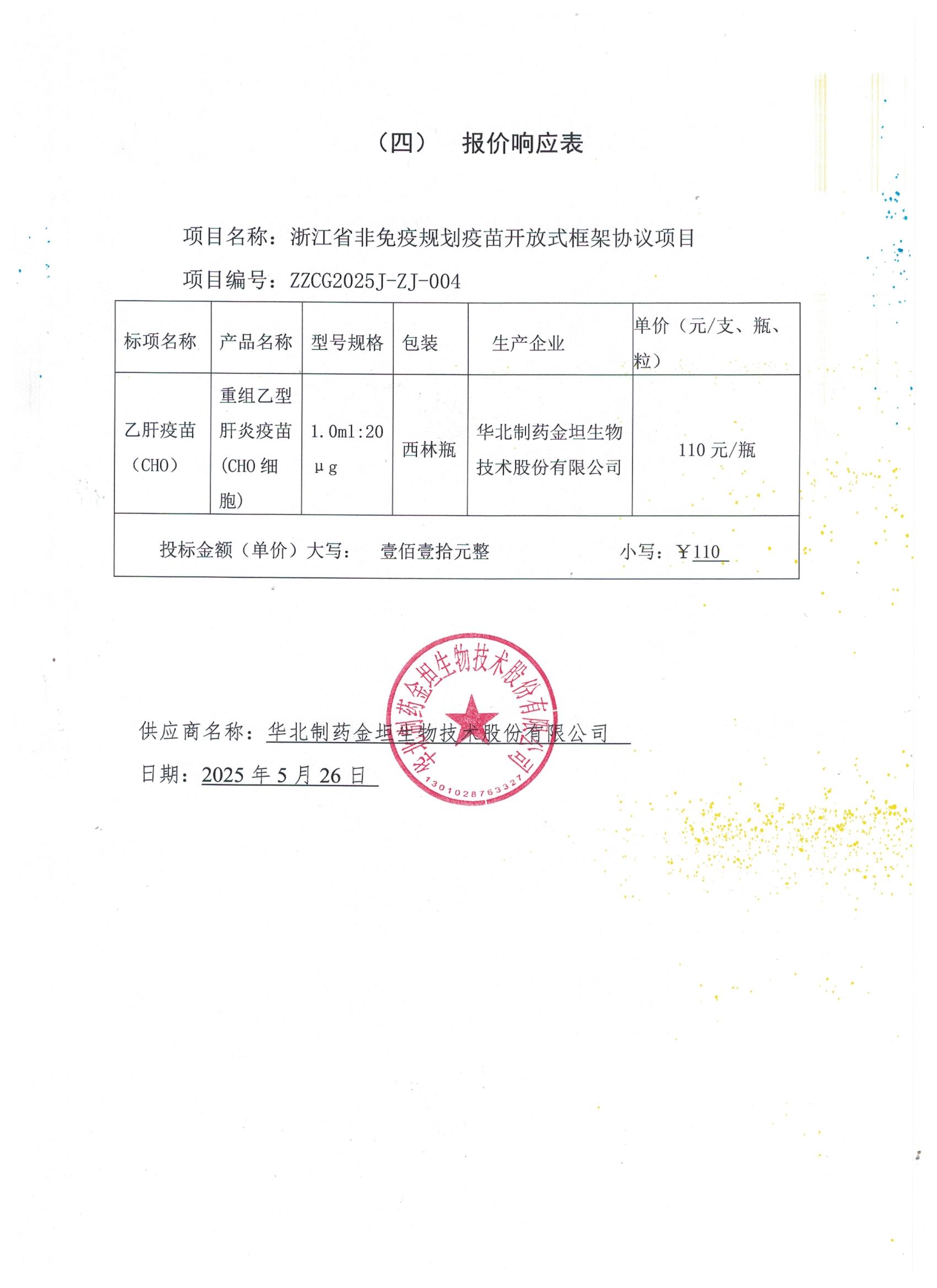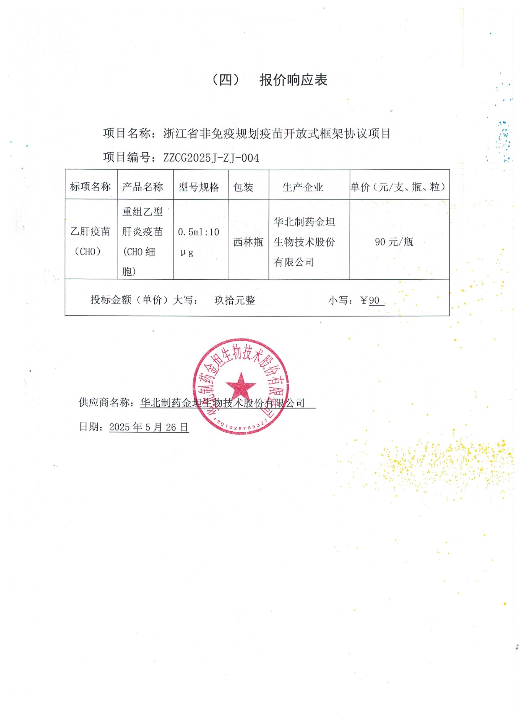 【浙江省疾病预防控制中心】华北制药金坦生物技术股份有限公司入围浙江省非免疫规划疫苗开放式框架协议项目的结果公告