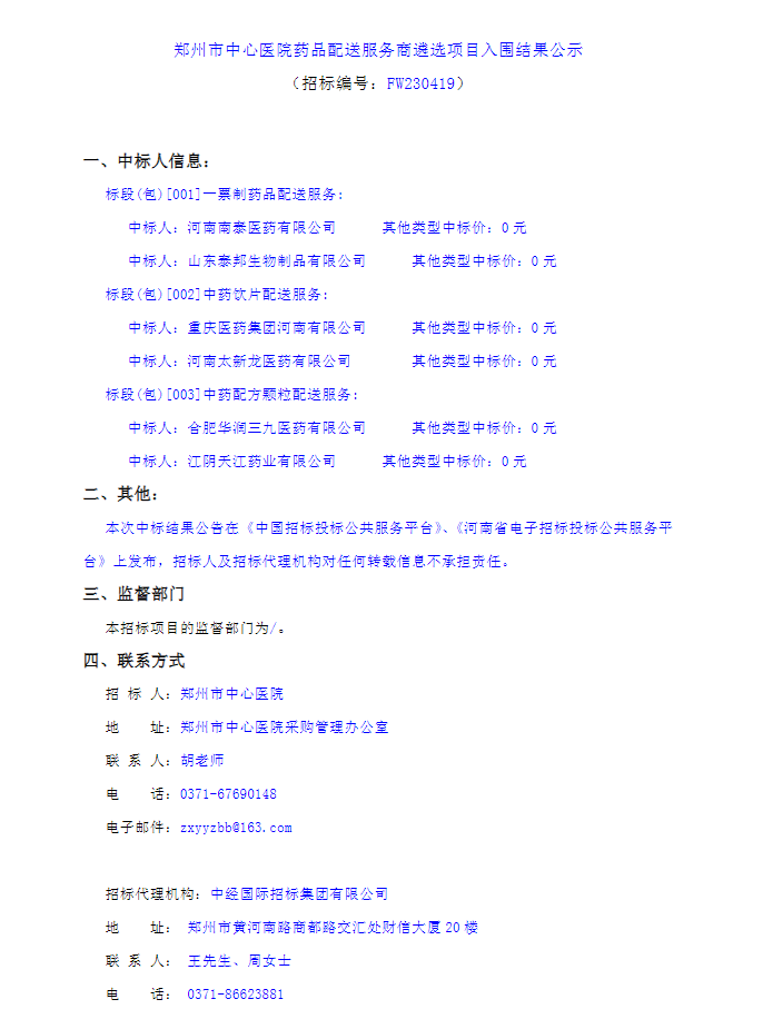 【郑州市中心医院】河南省郑州市中心医院药品配送服务商遴选项目入围结果公示