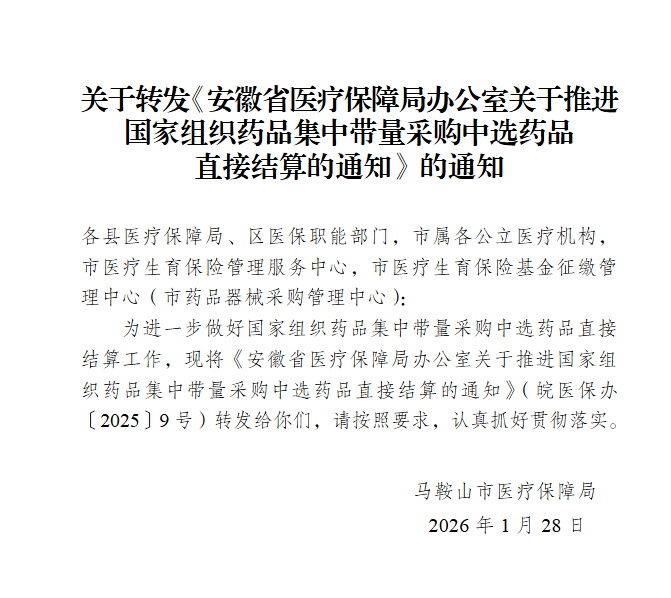 【马鞍山】关于转发《安徽省医疗保障局办公室关于推进国家组织药品集中带量采购中选药品直接结算的通知》的通知
