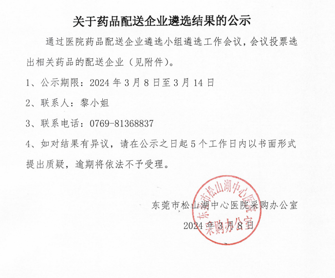 【东莞市松山湖中心医院】广东省东莞市松山湖中心医院药品配送企业遴选结果公示(2024.3.8)