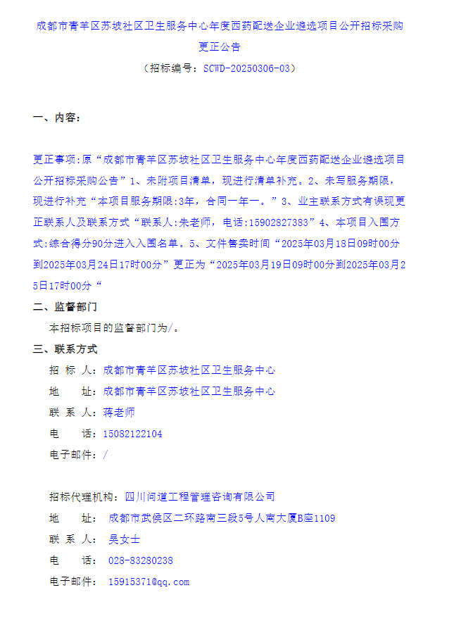 【成都市青羊区苏坡社区卫生服务中心】四川省成都市青羊区苏坡社区卫生服务中心年度西药配送企业遴选项目公开招标采购更正公告