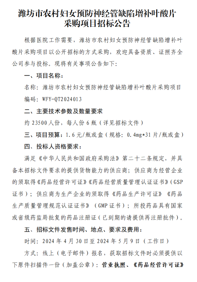 【潍坊市妇幼保健院】山东省潍坊市农村妇女预防神经管缺陷增补叶酸片采购项目招标公告
