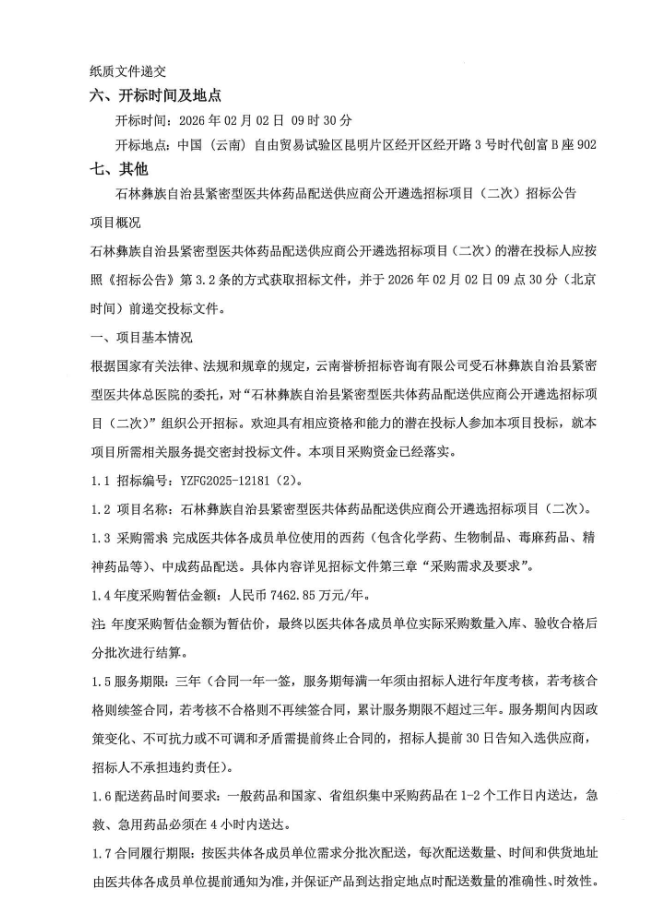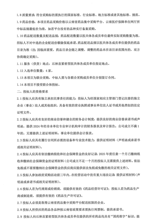 【昆明市石林彝族自治县紧密型医共体总医院】云南省昆明市石林彝族自治县紧密型医共体药品配送供应商公开遴选招标项目(二次)招标公告
