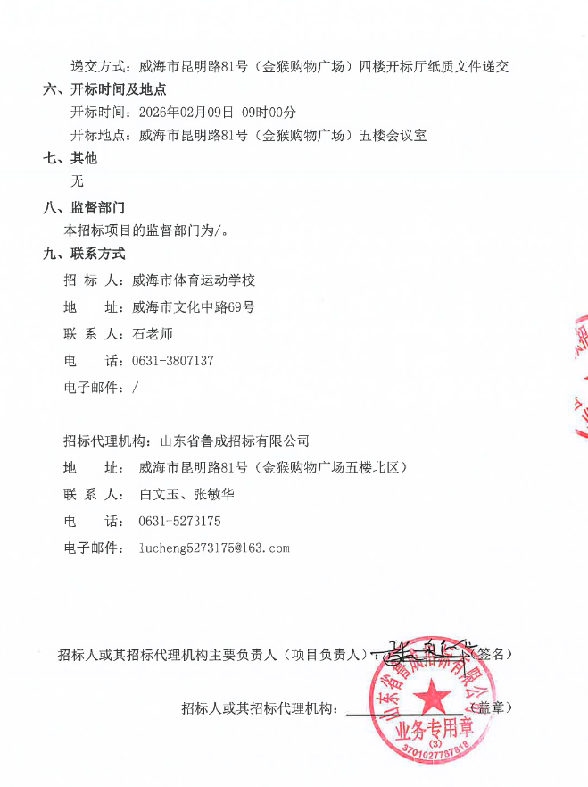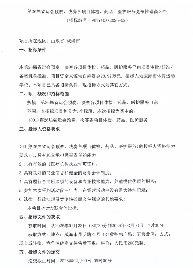 【威海市体育运动学校】山东省威海市体育运动学校第26届省运会预赛、决赛各项目体检、药品、医护服务竞争性磋商公告