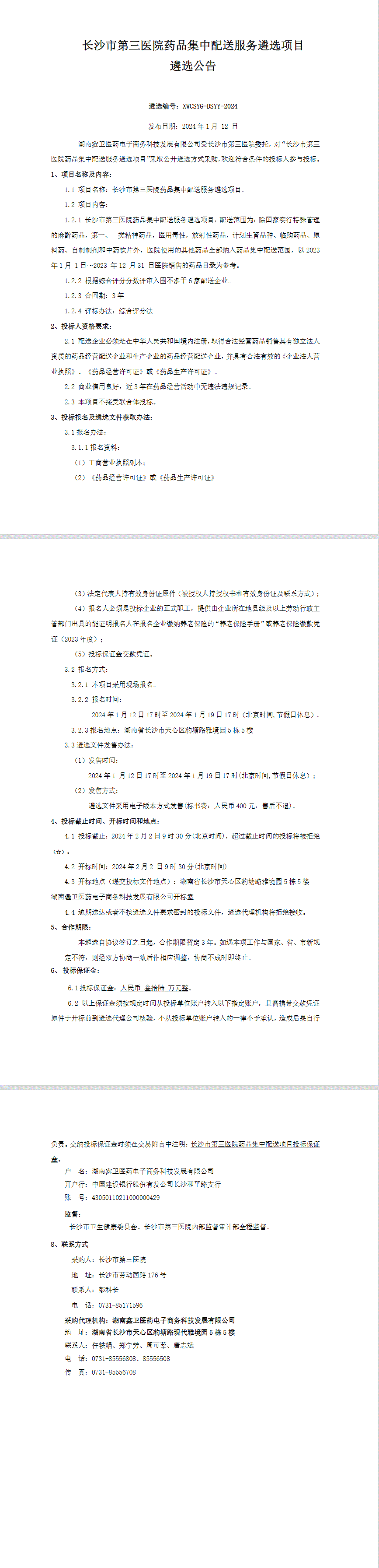 【长沙市第三医院】湖南省长沙市第三医院药品集中配送服务遴选项目遴选公告