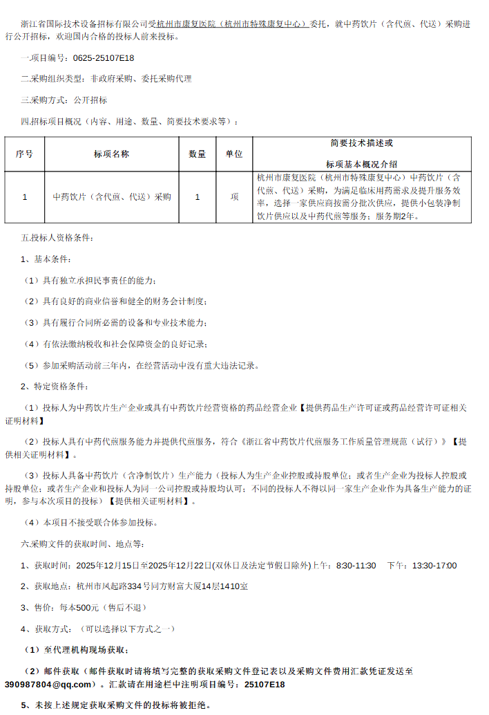 【杭州市康复医院】浙江省杭州市康复医院(杭州市特殊康复中心)中药饮片(含代煎、代送)采购招标公告