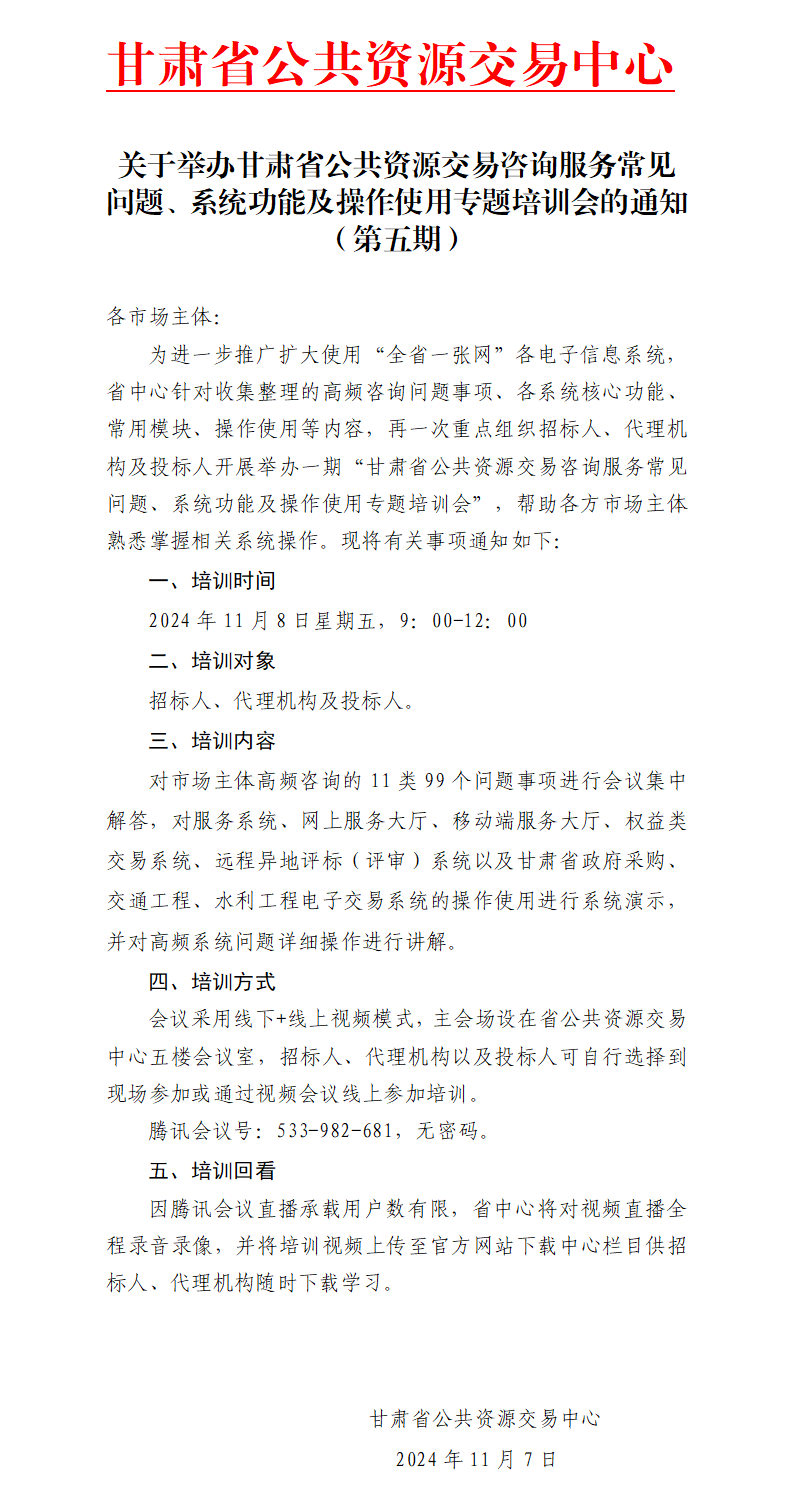 为进一步推广扩大使用“全省一张网”各电子信息系统,省中心针对收集整理的高频咨询问题事项、各系统核心功能、常用模块、操作使用等内容,再一次重点组织招标人、代理机构及投标人开展举办一期“甘肃省公共资源交易咨询服务常见问题、系统功能及操作使用专题培训会”,帮助各方市场主体熟悉掌握相关系统操作。现将有关事项通知如下: