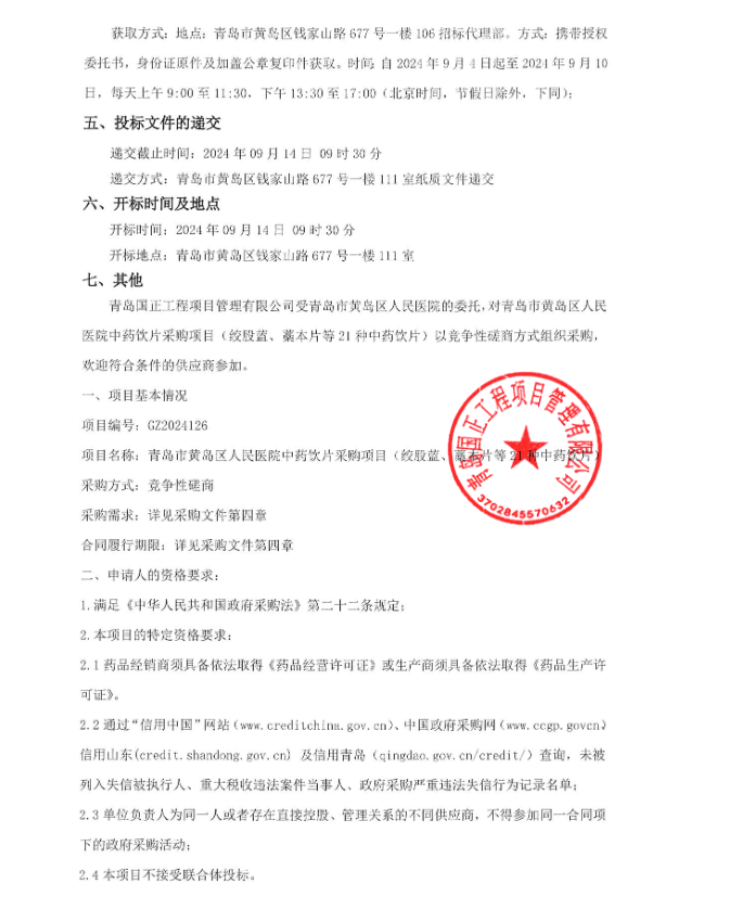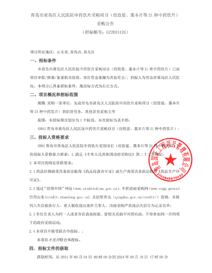 【青岛市黄岛区人民医院】山东省青岛市黄岛区人民医院中药饮片采购项目(绞股蓝、藁本片等21种中药饮片)采购公告