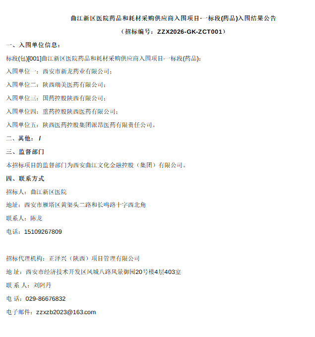 【西安市曲江新区医院】陕西省曲江新区医院药品和耗材采购供应商入围项目·一标段(药品)入围结果公告