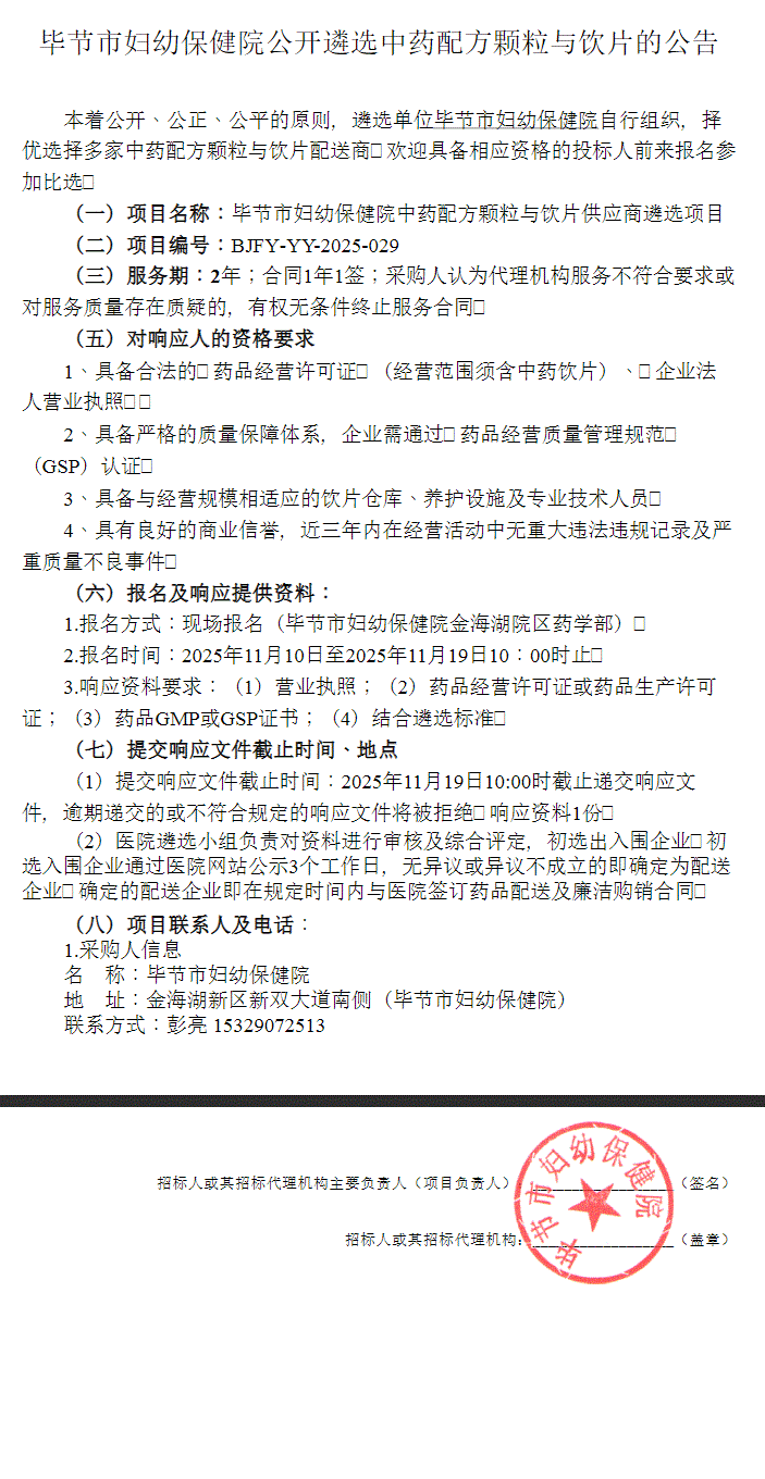 【毕节市妇幼保健院】贵州省毕节市妇幼保健院公开遴选中药配方颗粒与饮片的公告