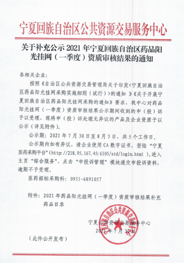 【宁夏】2021年宁夏自治区关于补充公示2021年宁夏回族自治区药品阳光挂网(一季度)资质审核结果的通知