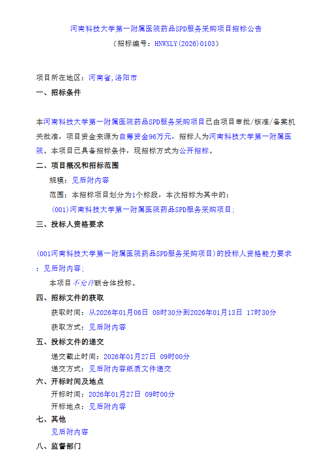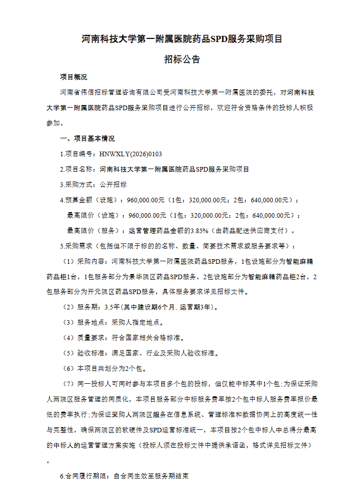 【河南科技大学第一附属医院】河南科技大学第一附属医院药品SPD服务采购项目招标公告
