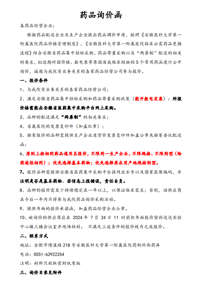 【安徽医科大学第一附属医院】安徽医科大学第一附属医院药品询价函(2024年第六次)