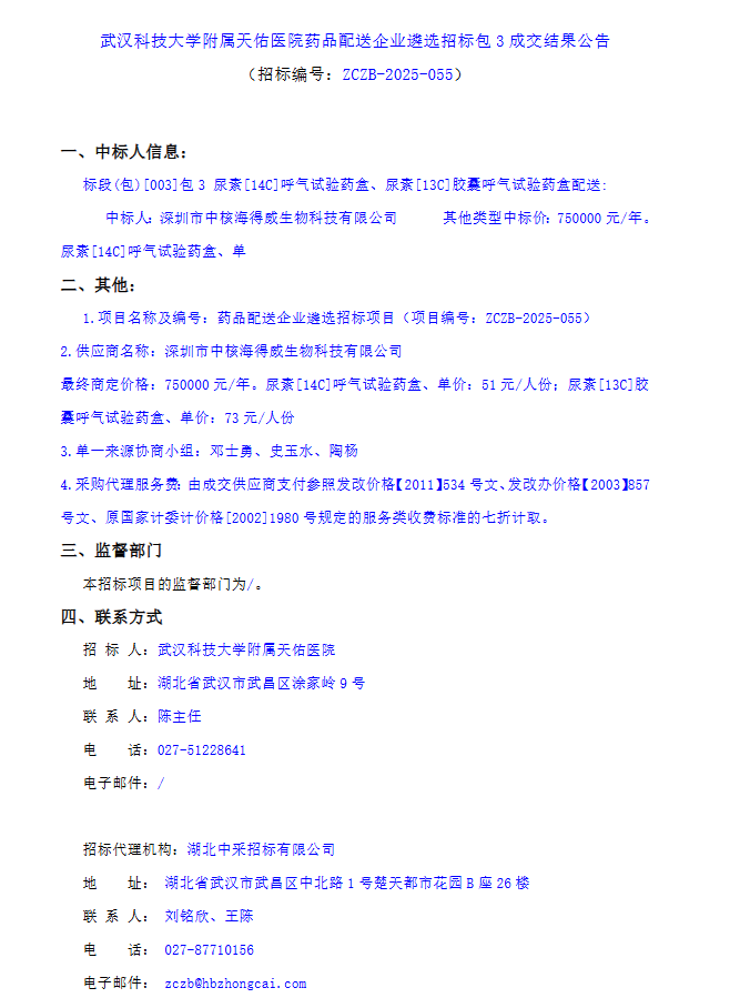 【武汉科技大学附属天佑医院】湖北省武汉科技大学附属天佑医院药品配送企业遴选招标包3成交结果公告