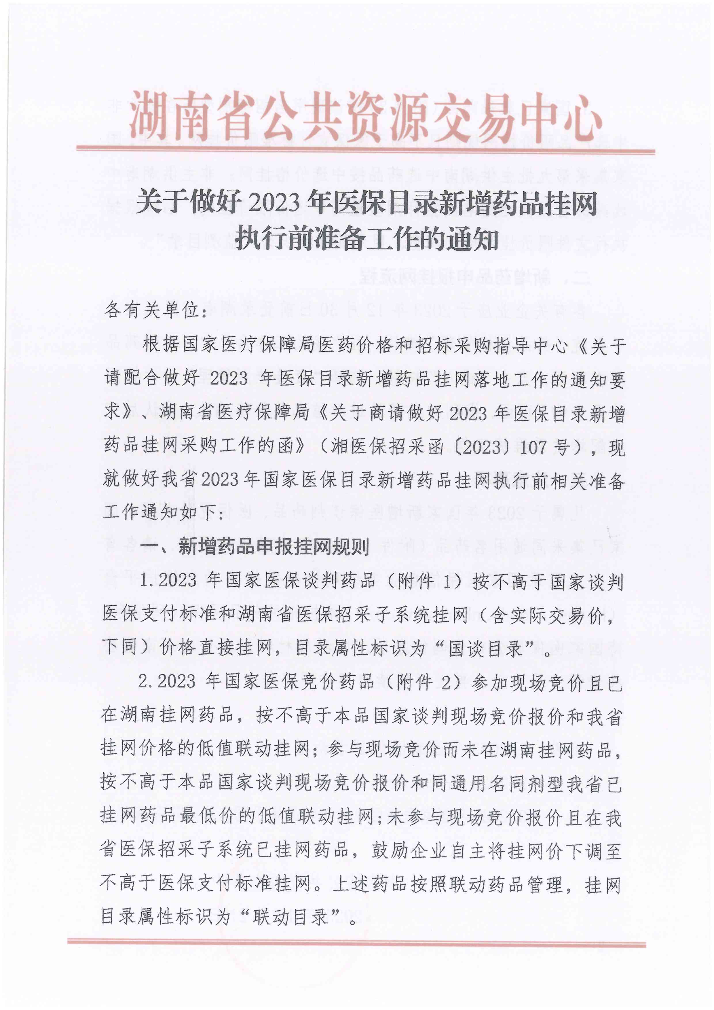 根据国家医疗保障局医药价格和招标采购指导中心《关于请配合做好2023年医保目录新增药品挂网落地工作的通知要求》、湖南省医疗保障局《关于商请做好2023年医保目录新增药品挂网采购工作的函》(湘医保招采函〔2023)107号〕,现就做好我省2023年国家医保目录新增药品挂网执行前相关准备工作通知如下:
