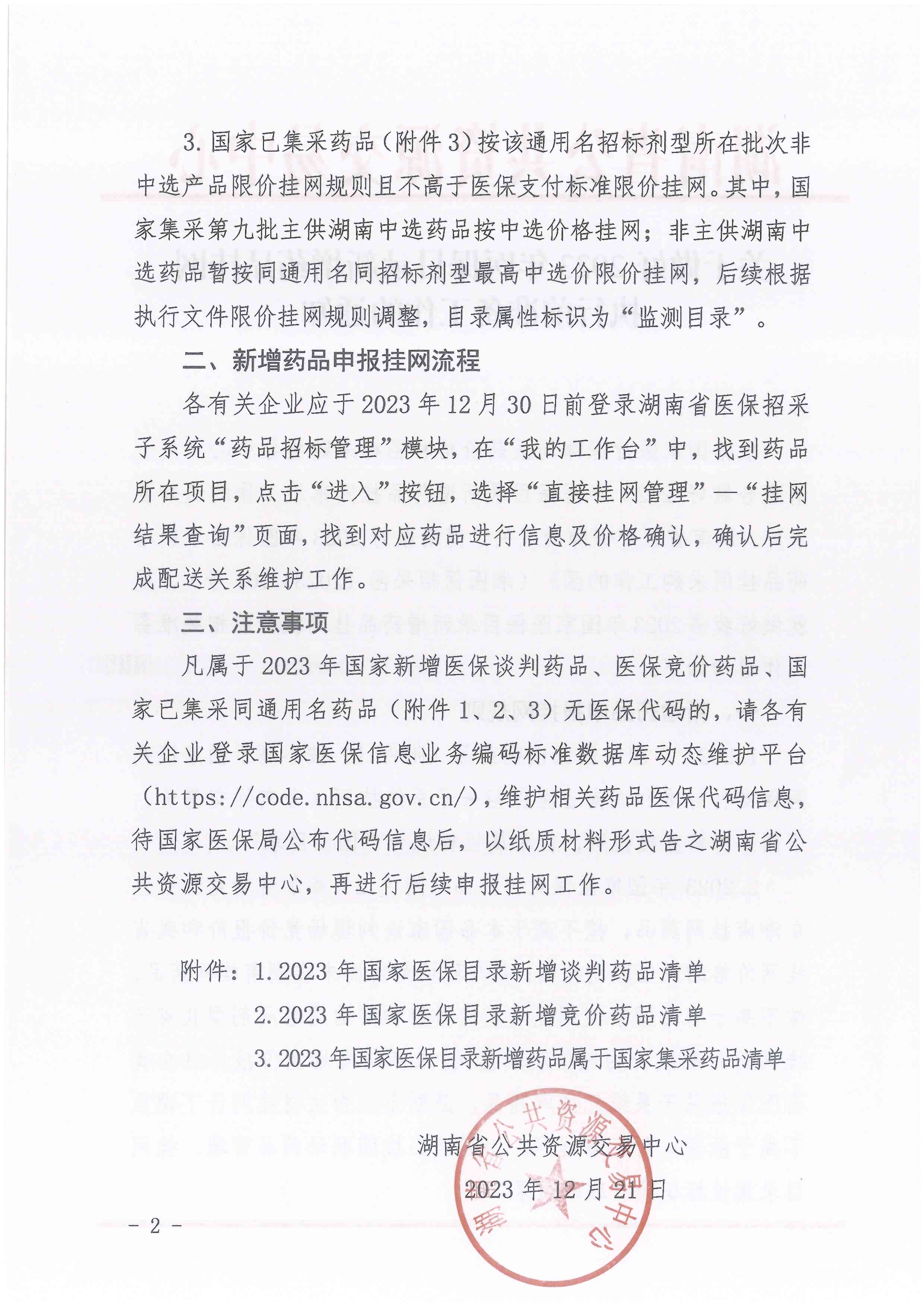 凡属于2023年国家新增医保谈判药品、医保竞价药品、国家已集采同通用名药品(附件1、2、3)无医保代码的,请各有关企业登录国家医保信息业务编码标准数据库动态维护平台(https://code.nhsa.gov.cn/),维护相关药品医保代码信息,待国家医保局公布代码信息后,以纸质材料形式告之湖南省公共资源交易中心,再进行后续申报挂网工作。