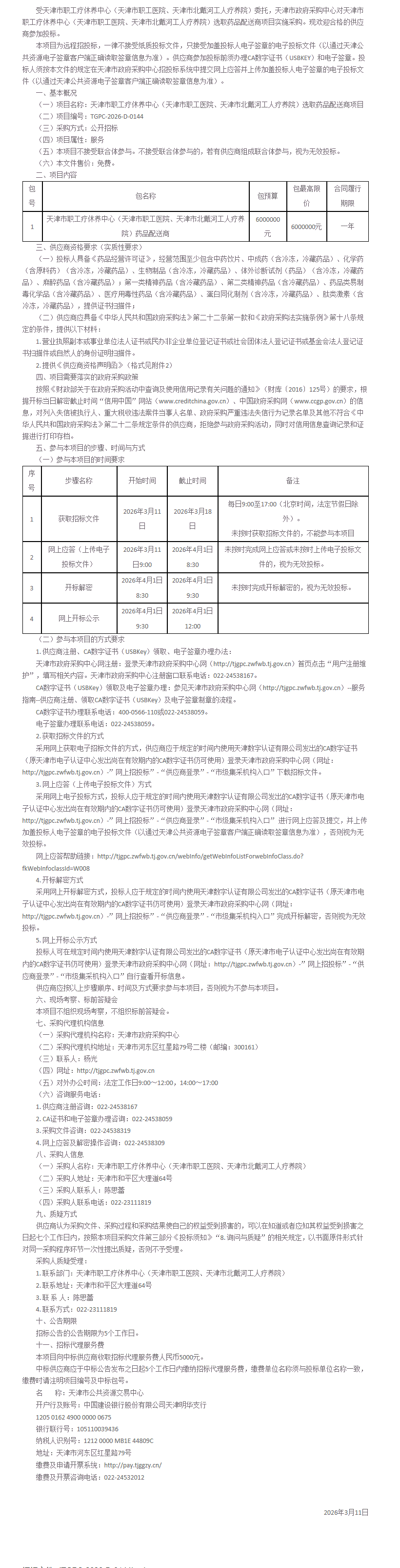【天津市职工疗休养中心】 天津市职工疗休养中心(天津市职工医院、天津市北戴河工人疗养院)选取药品配送商项目(项目编号:TGPC-2026-D-0144)公开招标公告