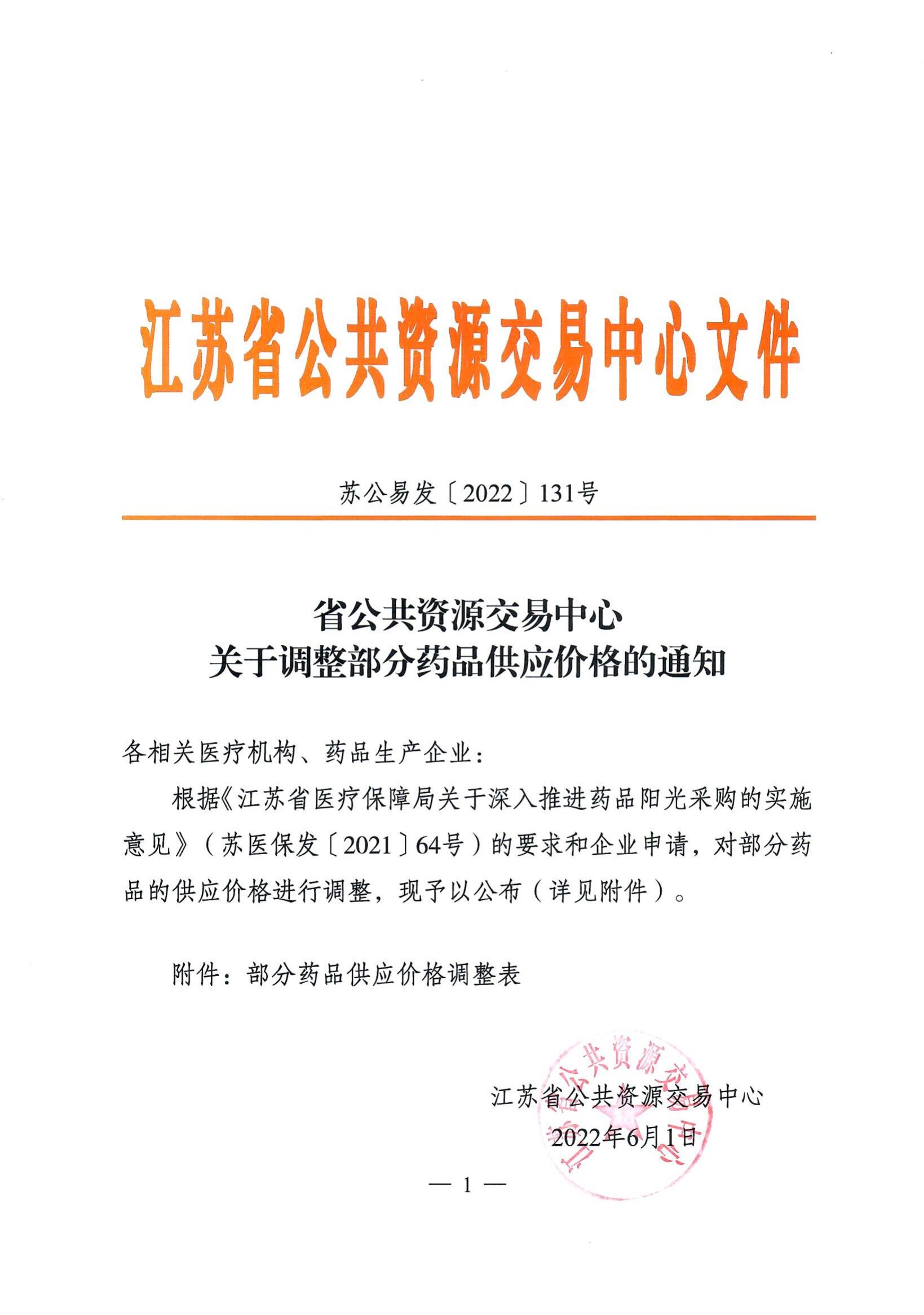 【江苏】省公共资源交易中心关于调整部分药品供应价格的通知
