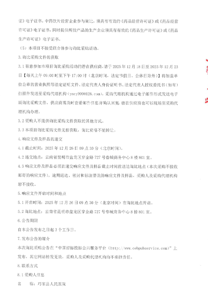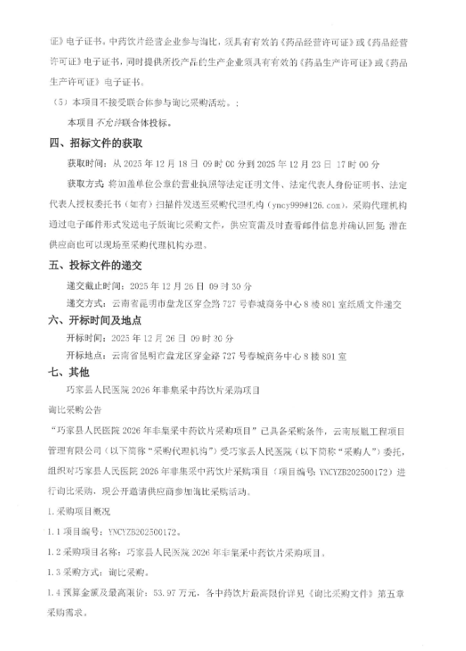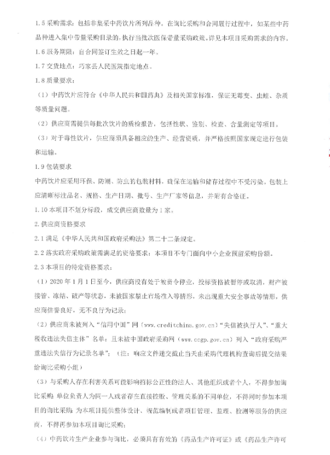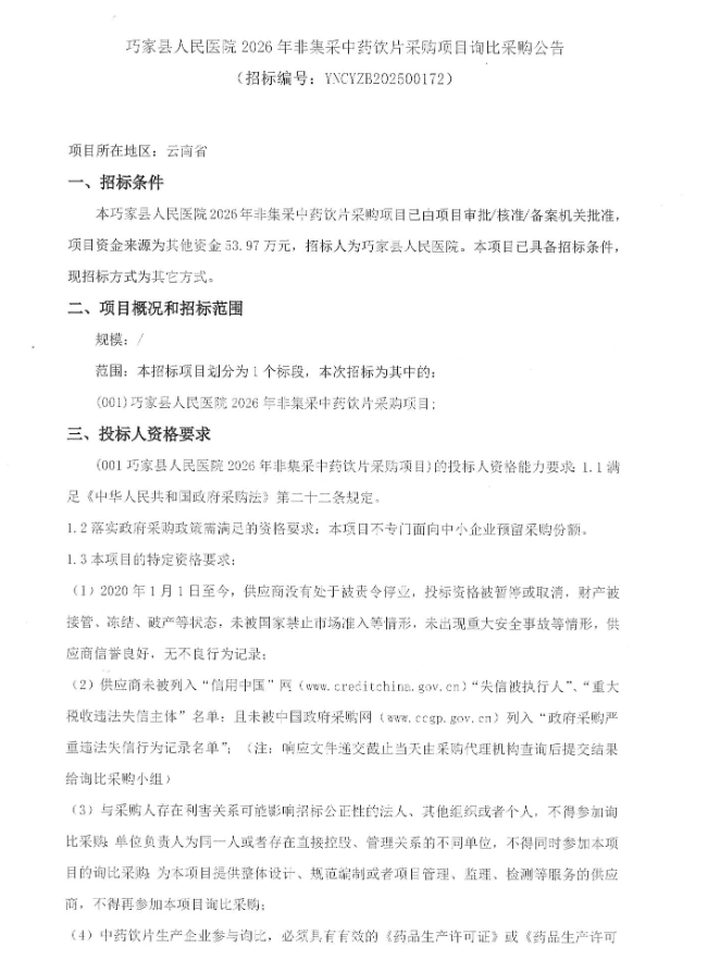 【昭通市巧家县人民医院】云南省昭通市巧家县人民医院2026年非集采中药饮片采购项目询比采购公告