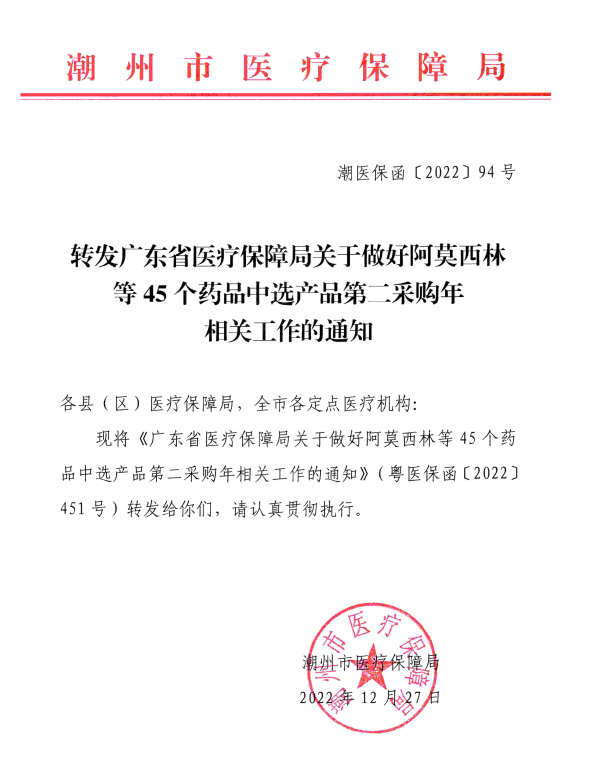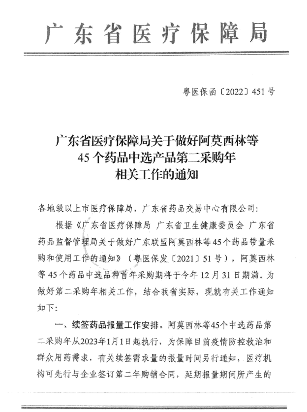 现将《广东省医疗保障局关于做好阿莫西林等45个药品中选产品第二采购年相关工作的通知》(粤医保函〔2022〕451号)转发给你们,请认真贯彻执行。