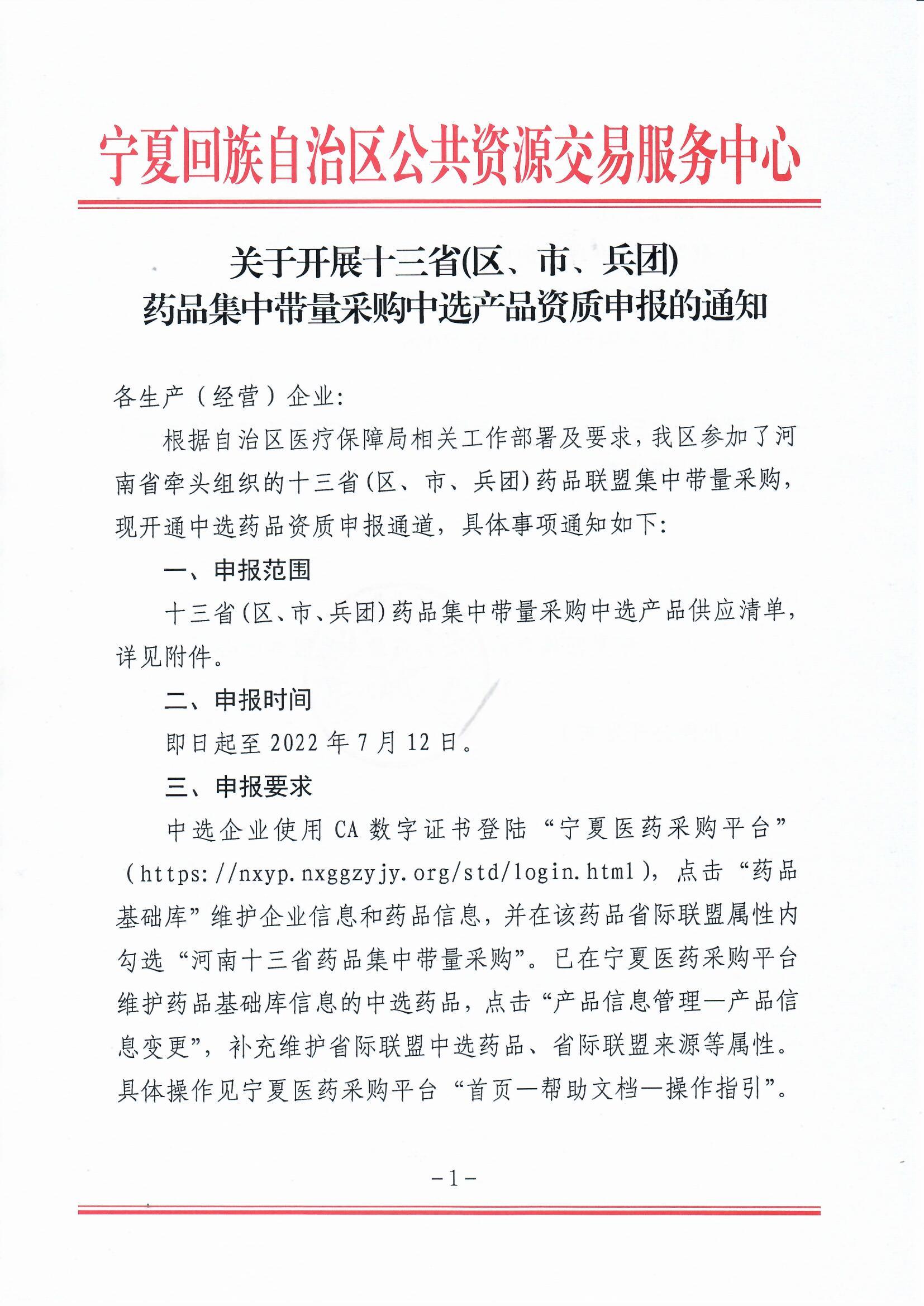 【宁夏】宁夏回族自治区关于开展十三省(区、市、兵团)药品集中带量采购中选产品资质申报的通知