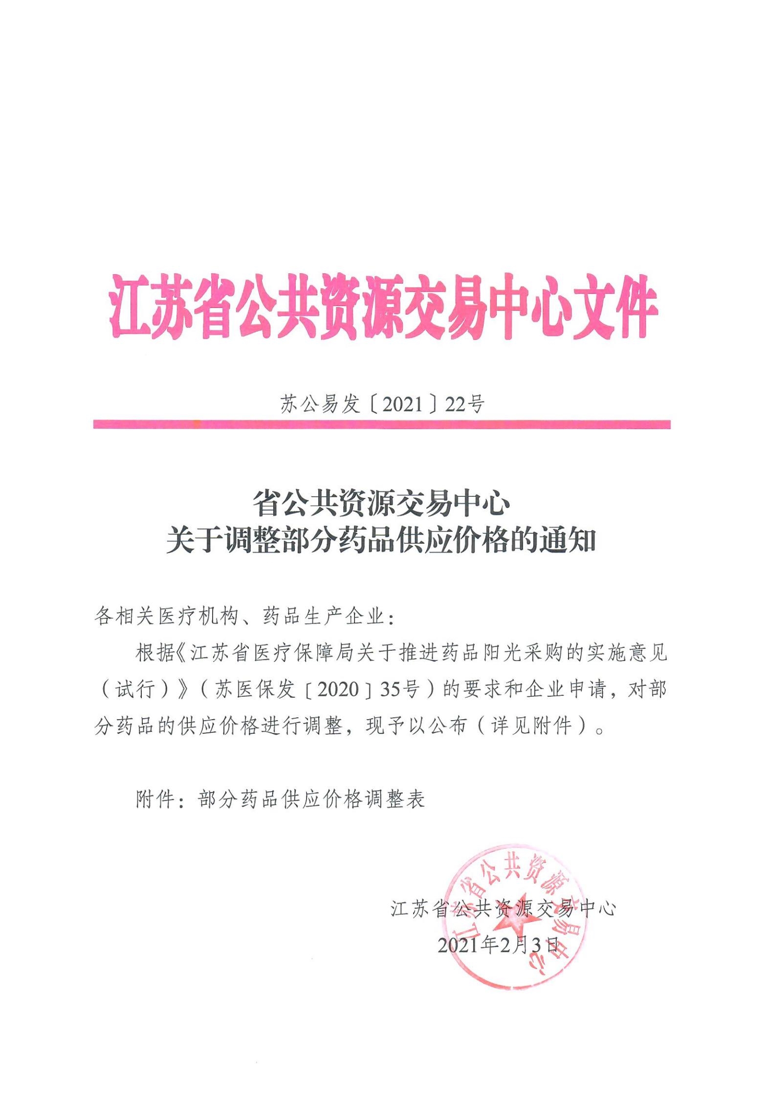 【江苏】2021年江苏省公共资源交易中心关于调整部分药品供应价格的通知 苏公易发[2021]22号
