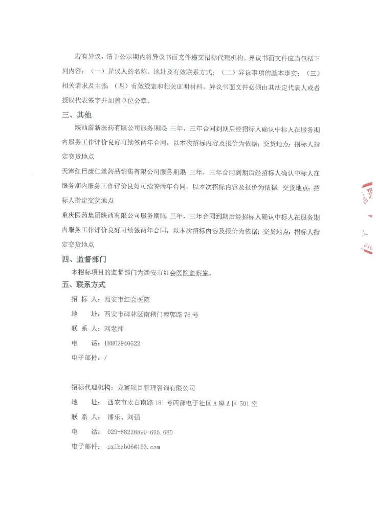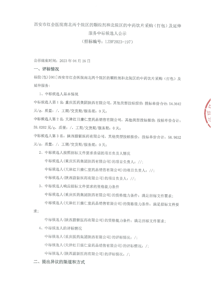 【西安市红会医院】陕西省西安市红会医院南北两个院区的颗粒剂和北院区的中药饮片采购(打包)及延伸服务中标候选人公示