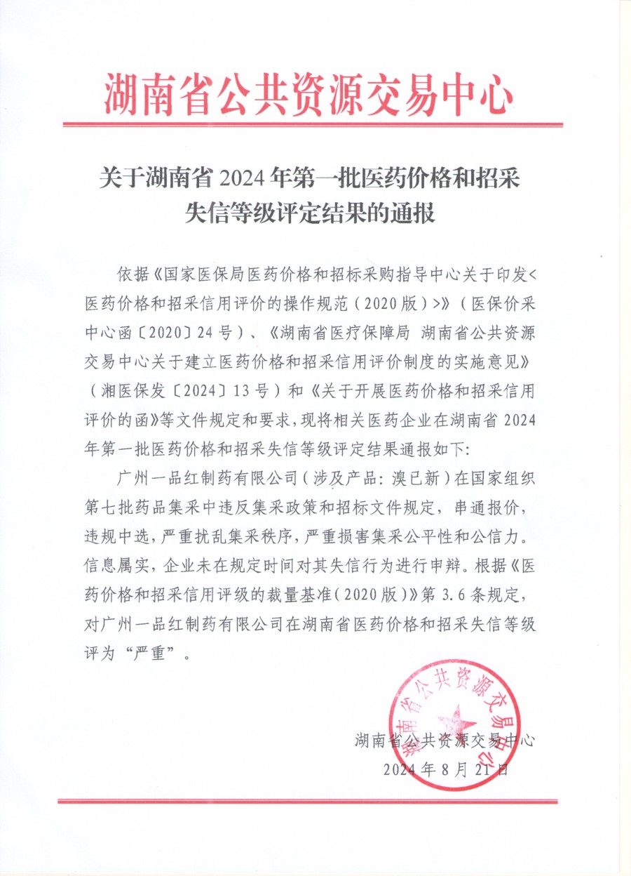 【湖南】关于湖南省2024年第一批医药价格和招采失信等级评定结果的通报