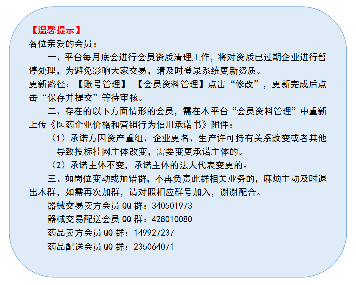 一、平台每月底会进行会员资质清理工作,将对资质已过期企业进行暂停处理,为避免影响大家交易,请及时登录系统更新资质。