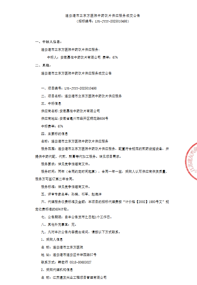 【连云港市立东方医院】江苏省连云港市立东方医院中药饮片供应服务成交公告