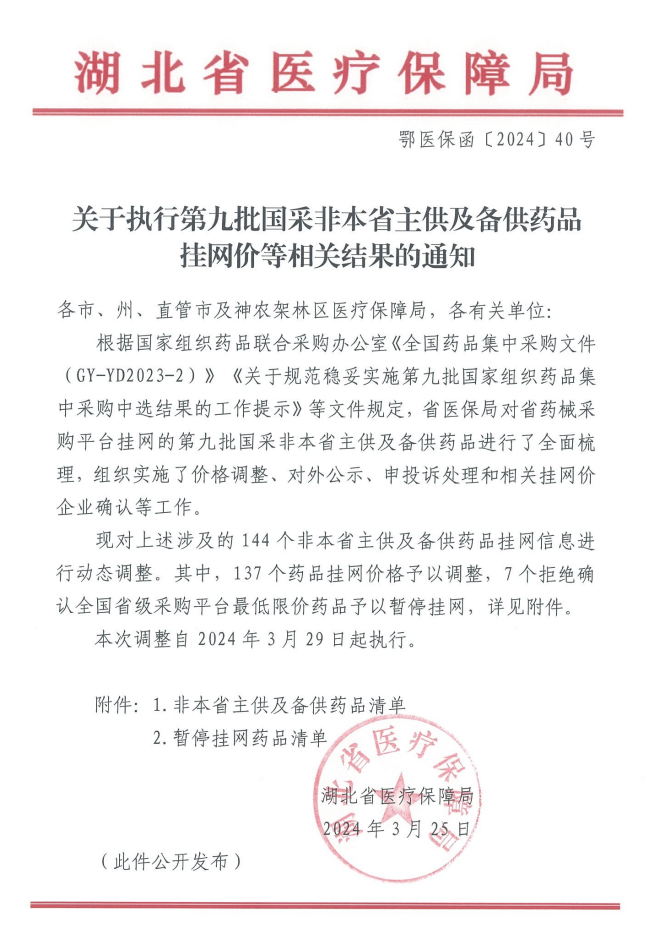 【湖北】关于执行第九批国采非本省主供及备供药品挂网价等相关结果的通知