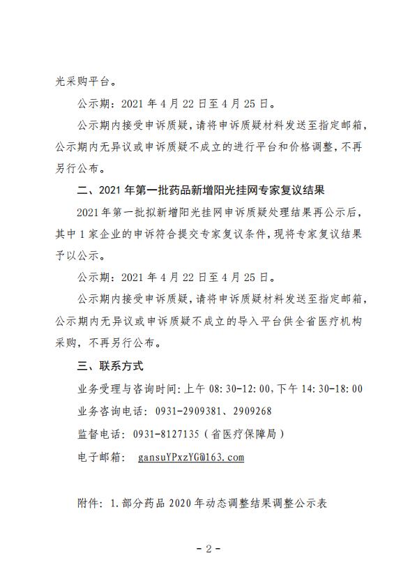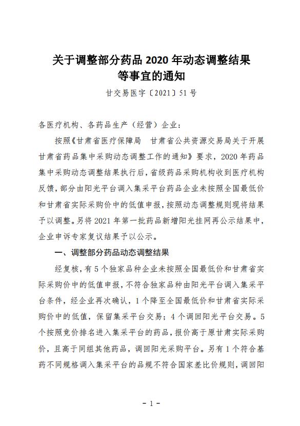 【甘肃】甘肃省关于调整部分药品2020年动态调整结果等事宜的通知