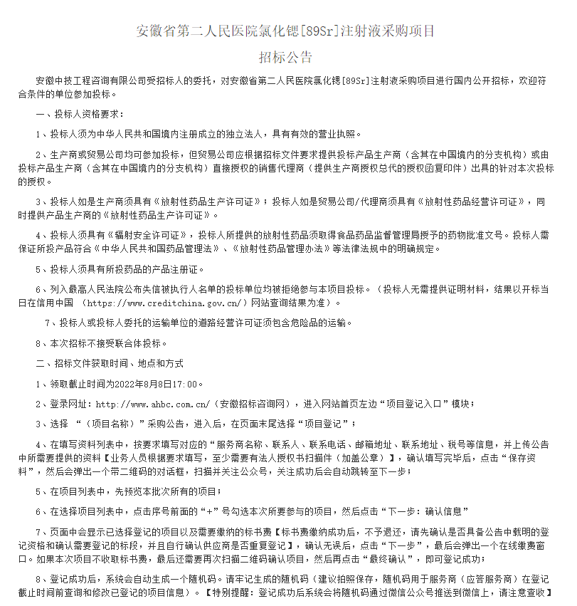 【安徽省第二人民医院】安徽省第二人民医院氯化锶〔89Sr〕注射液采购项目招标公告