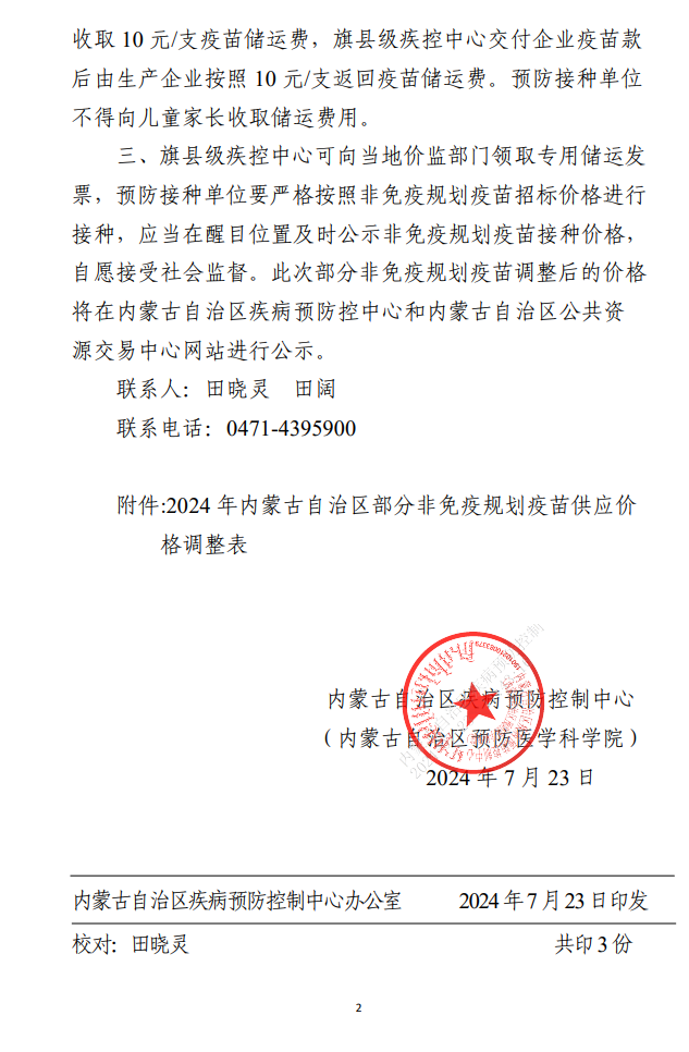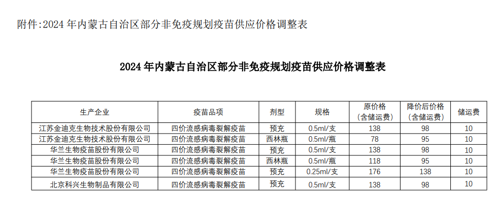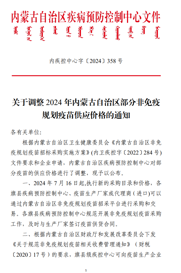 【内蒙】关于调整2024年内蒙古自治区部分免疫规划疫苗供应价格的通知