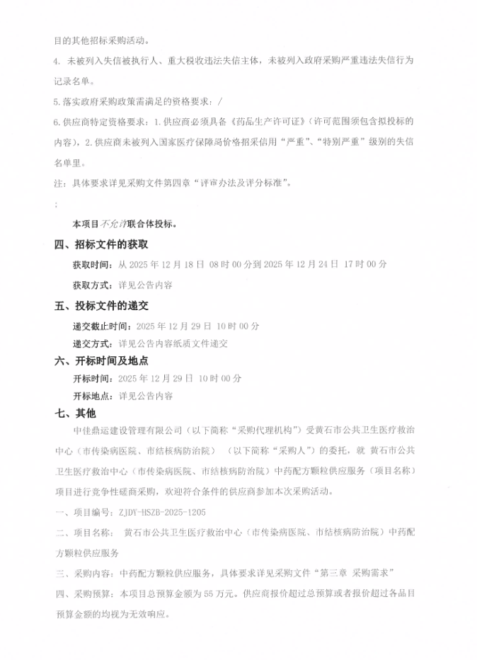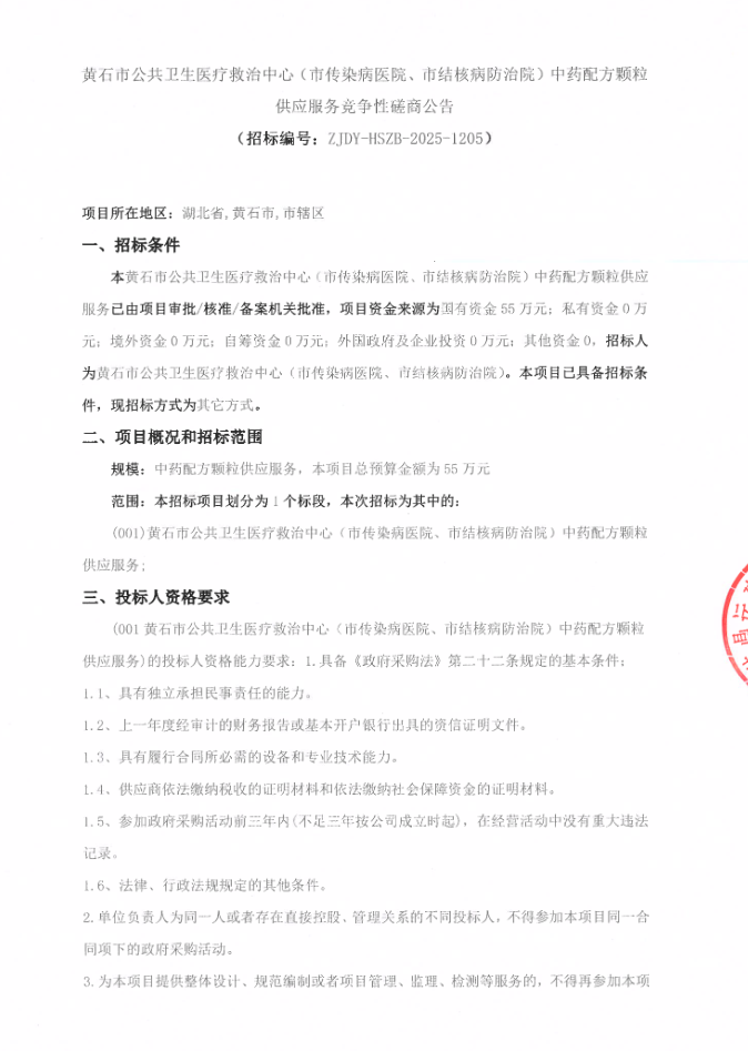 【黄石市公共卫生医疗救治中心】湖北省黄石市公共卫生医疗救治中心(市传染病医院、市结核病防治院)中药配方颗粒供应服务竞争性磋商公告