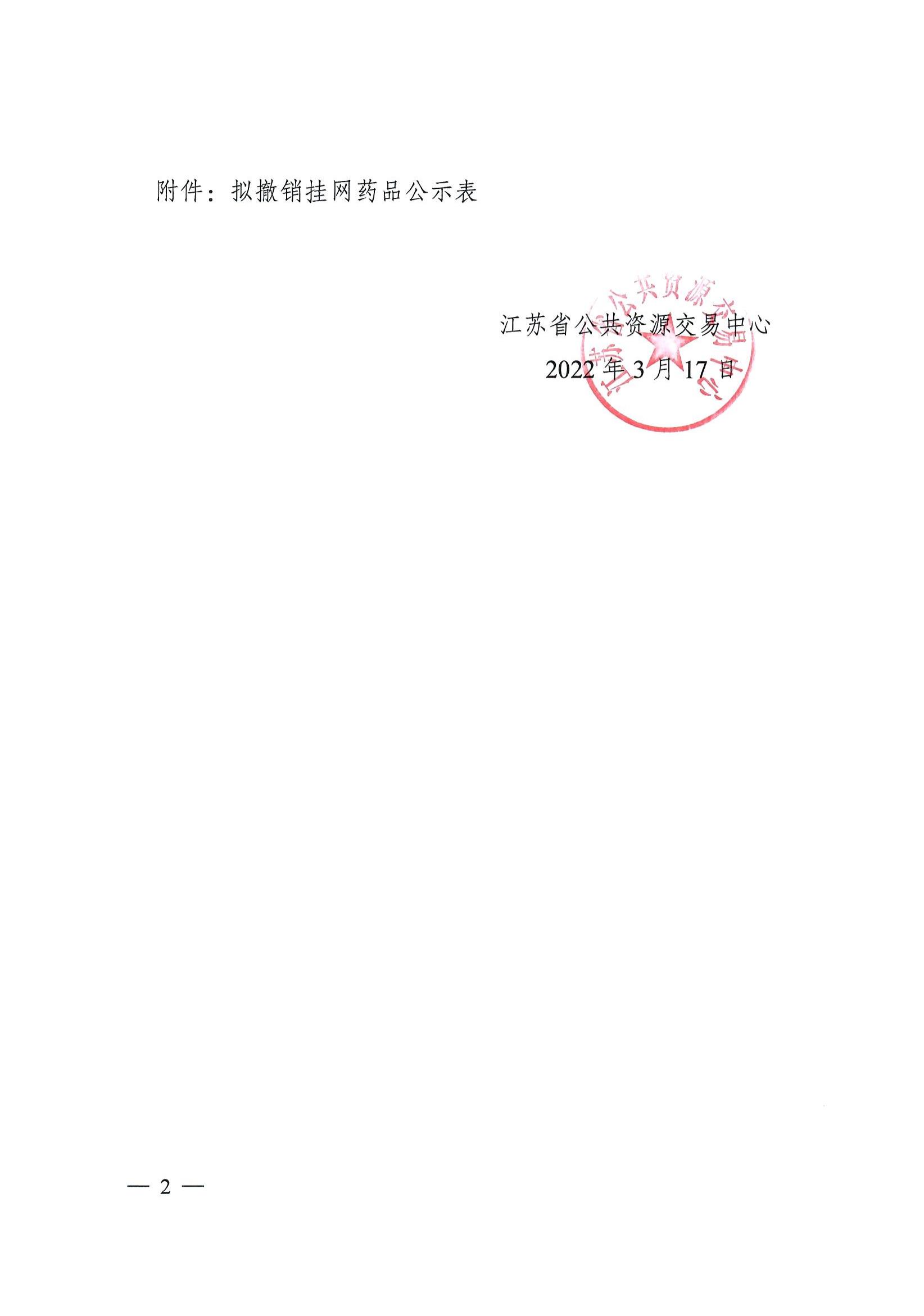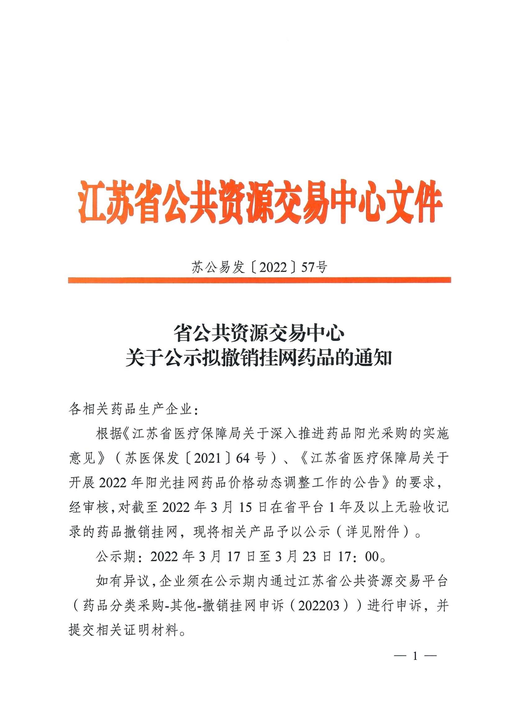 【江苏】江苏省公共资源交易中心关于公示拟撤销挂网药品的通知