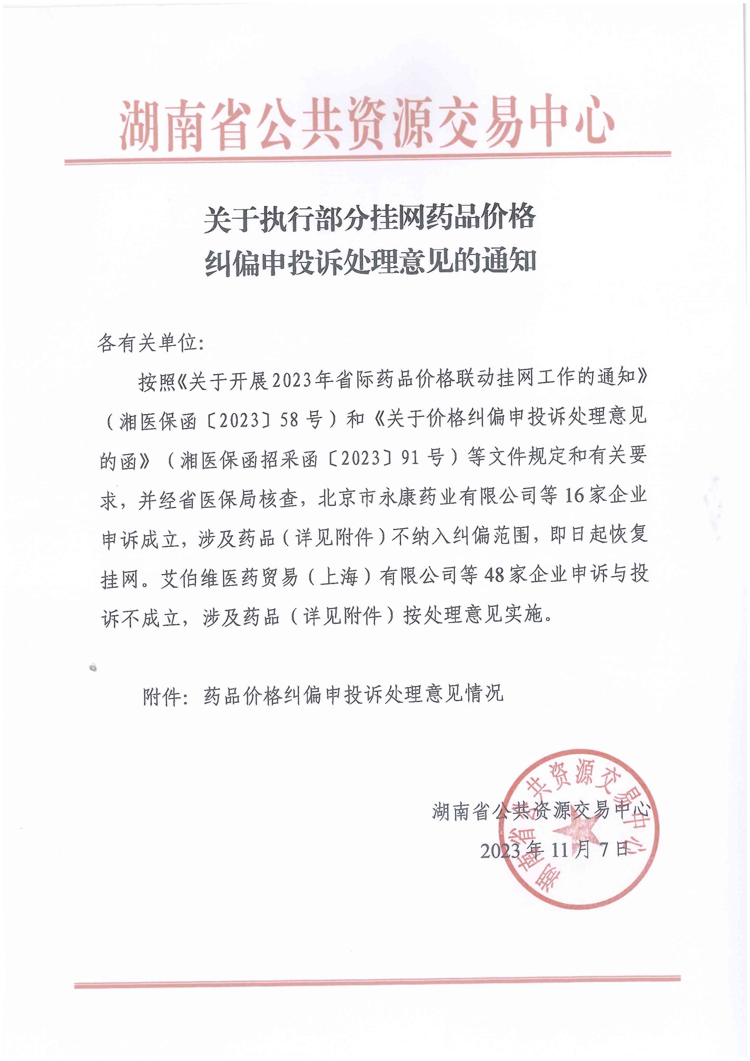 按照《关于开展2023年省际药品价格联动挂网工作的通知》(湘医保函〔2023〕58号)和《关于价格纠偏申投诉处理意见的函》(湘医保函招采函〔2023〕91号)等文件规定和有关要求,并经省医保局核查,北京市永康药业有限公司等16家企业申诉成立,涉及药品(详见附件)不纳入纠偏范围,即日起恢复挂网。艾伯维医药贸易(上海)有限公司等48家企业申诉与投诉不成立,涉及药品(详见附件)按处理意见实施。