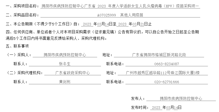 【揭阳市疾病预防控制中心】广东省揭阳市疾病预防控制中心广东省2023年度入学适龄女生人乳头瘤病毒(HPV)疫苗采购项目(揭阳市)采购需求征求意见公告