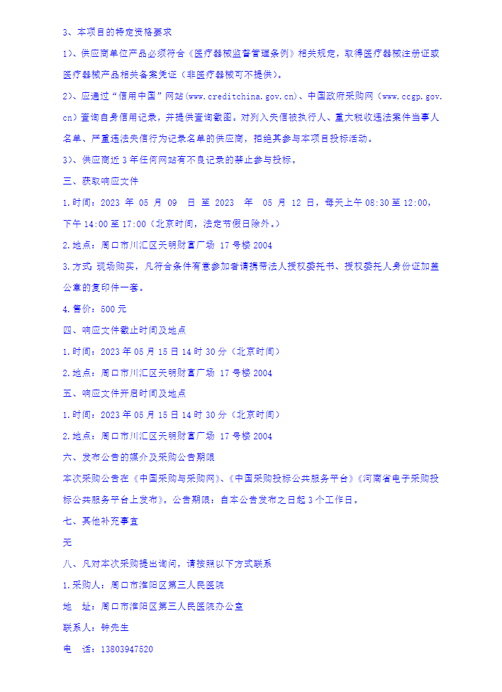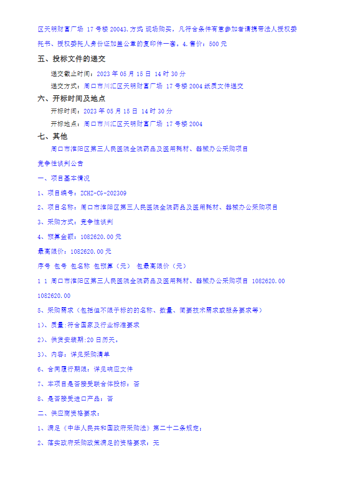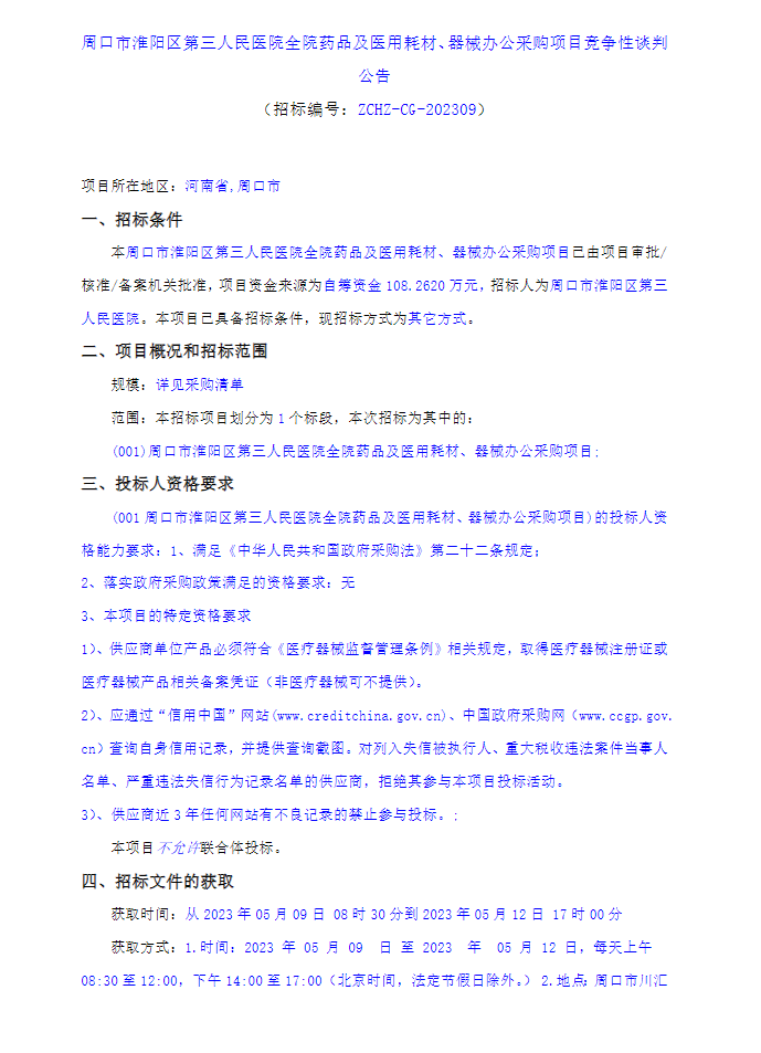 【周口市淮阳区第三人民医院】河南省周口市淮阳区第三人民医院全院药品及医用耗材、器械办公采购项目竞争性谈判公告