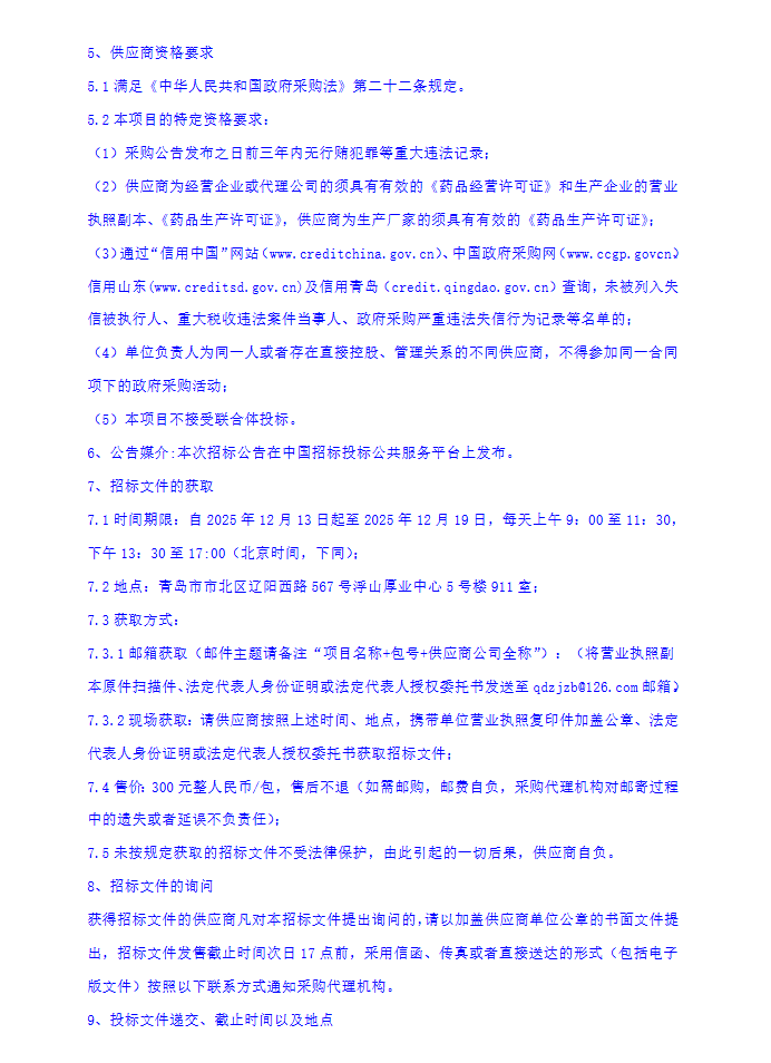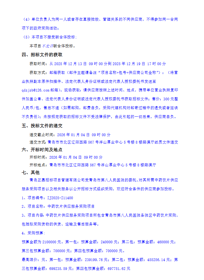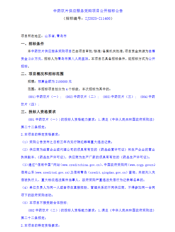 【青岛市第八人民医院】山东省青岛市第八人民医院中药饮片供应服务采购项目公开招标公告